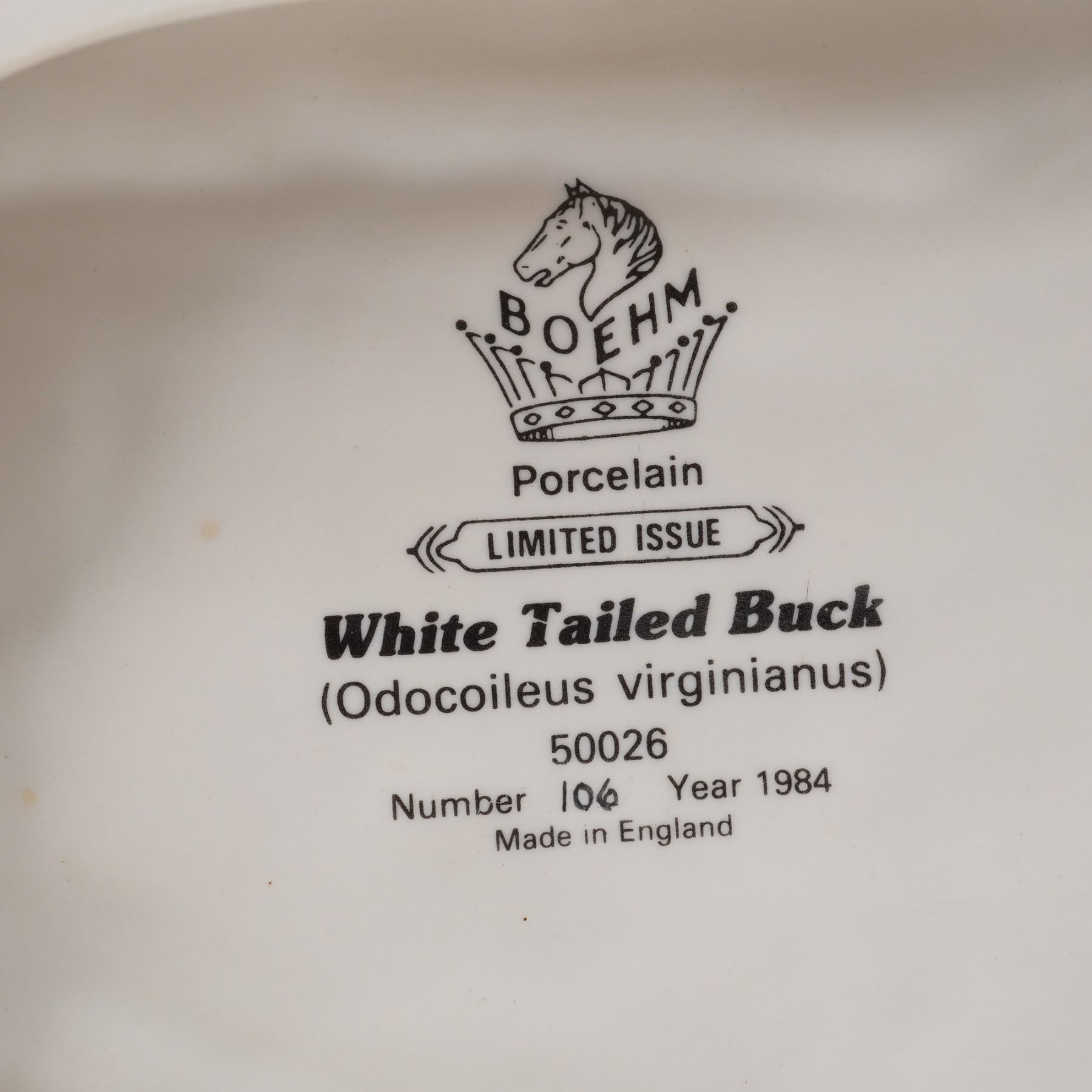 A finely detailed Boehm porcelain sculpture titled White Tailed Buck (Odocoileus virginianus), issued as a limited issue in 1984. This hand-painted figure captures the natural grace and vitality of the whitetail deer with exceptional realism, from its branching antlers to its alert stance. The underside is marked Boehm Porcelain, Limited Issue, White Tailed Buck, 50026, Number 106, Year 1984, Made in England. The piece is presented on a custom wooden base, adding elegance to its display.