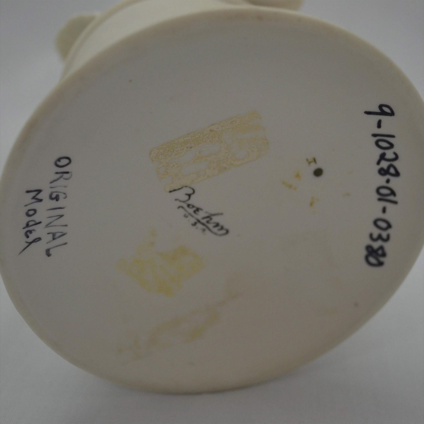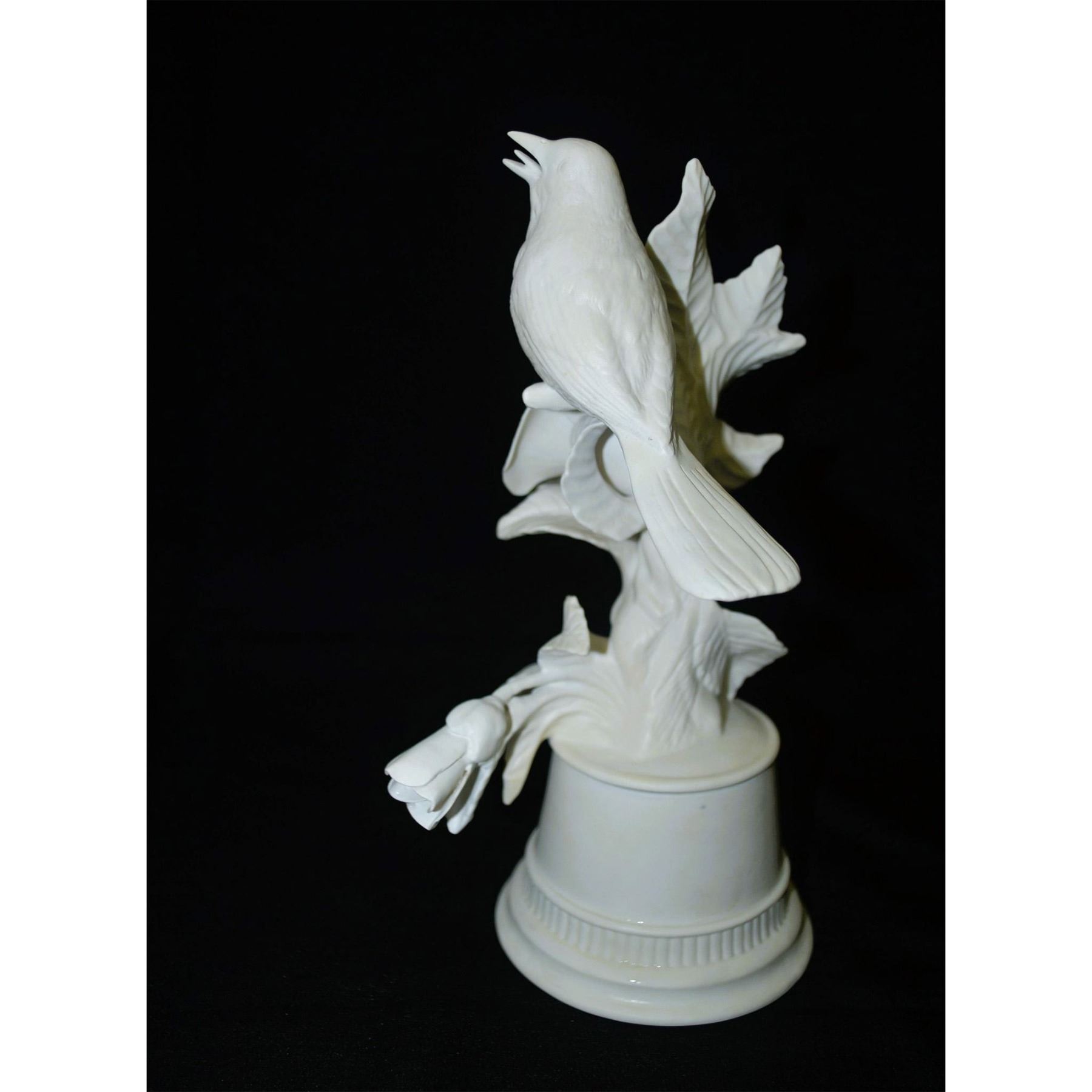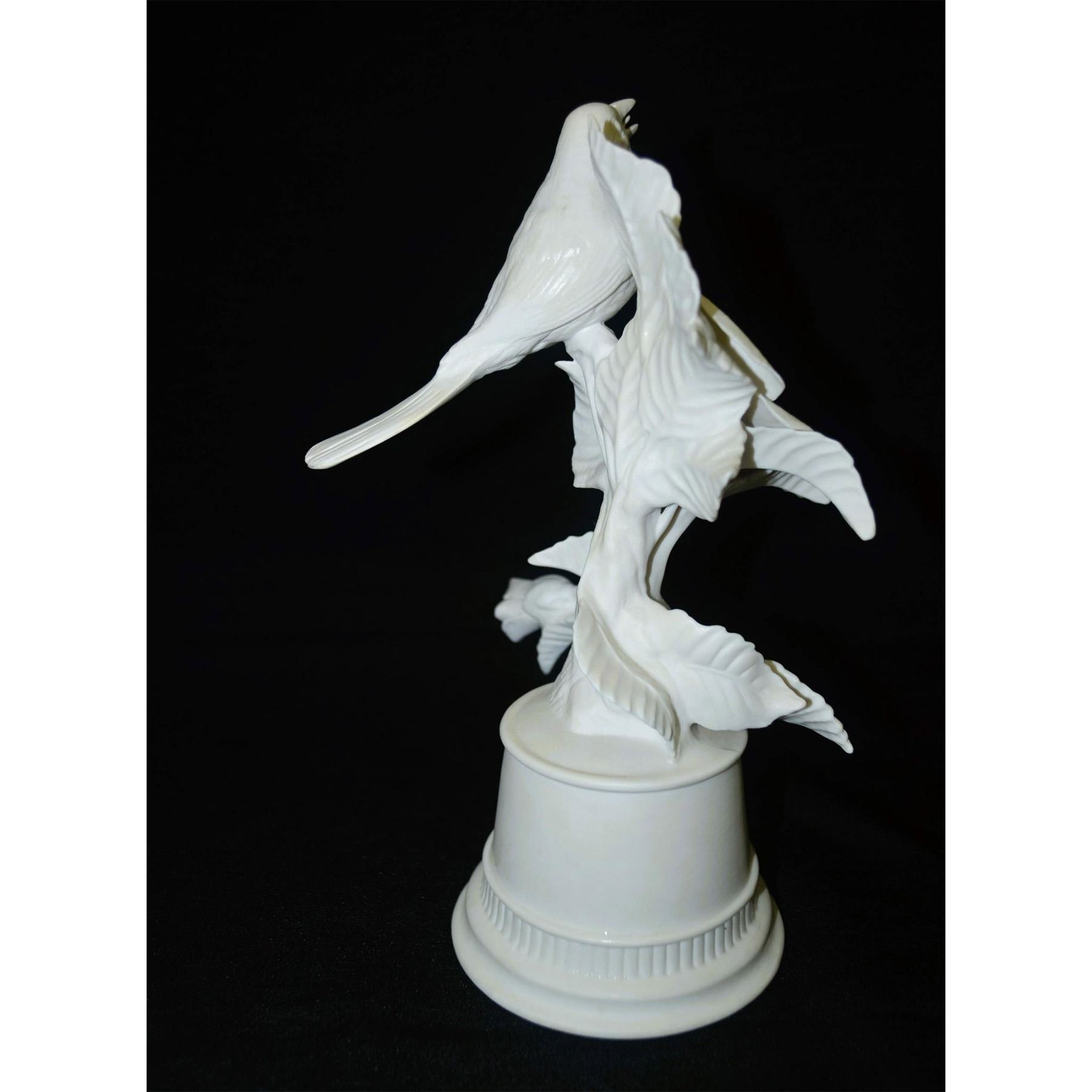 A White Model Prototype, 1957, in Bisque Porcelain, featuring the Yellow-Throated Warbler that was hand created, hand crafted by Ed Boehm and his Artists at the Boehm Studio in Trenton, NJ. USA. Featuring one of the earliest Bird Studies that Ed Boehm introduced in 1957 and was discontinued in June, 1975. This Bird Sculpture is the Yellow-Throated Warbler on Crimson-Eye Mallow. The White Bisque Prototype was the Model for the regular edition. This White Bisque Model was the prototype for the Yellow-Throated Warbler. Mr. Boehm made 6 all total in bisque, undecorated. This Model being offered is the only unique special prototype for the Yellow-Throated Warbler completed edition of the Bird Sculpture. This was the third unlimited edition adult bird introduced in 1975, and it was assigned the Boehm Studiomark Number 431. It shows a male, in song, perched on a Crimson-Eye Mallow on a formal pedestal base. 10"H. The RPC number assigned was RPC-1028-01. Authentic Backstamp RPC number, 9-1028-01-0380, on the underside, also signed Boehm in script, with USA written in Script under the Signature, this signed by Mr. Edward Marshall Boehm himself, and in block print, the words Original Model on the outer side of the bell jar base, underside. For further reference see: The Porcelain Art of Edward Marshall Boehm Book, p. 223. Provenance: Original Owner - Reece Palley. Obtained by Gwendolyn Reasoner, Owner of Re Vann Galleries in 1987. Condition: Very Good, Minor age related wear. From the Archival Collection of Re Vann Galleries, G.Reasoner, Owner.