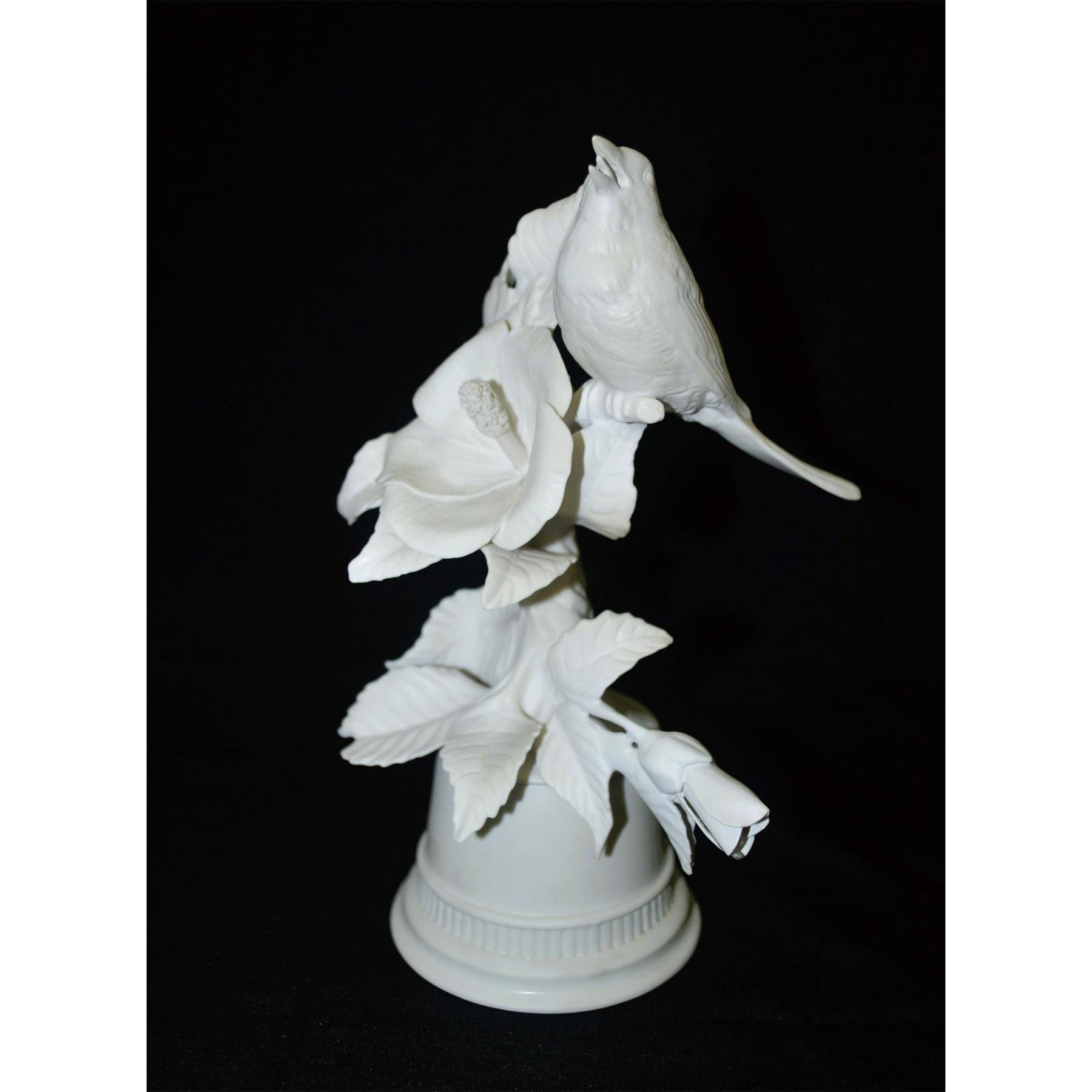 Boehm Porcelain Yellow-Throated Warbler on Crimson -Eye Mallow Bird Sculpture, White Model Prototype