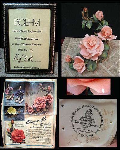 Boehm porcelain "Elizabeth of Glannis Rose" Ltd. ed of 500 pieces, this is number 3 of the edition. Piece is signed by the artist on underside (see images). One petal is broken and there is a small chip - again, see images. No box. With provenance