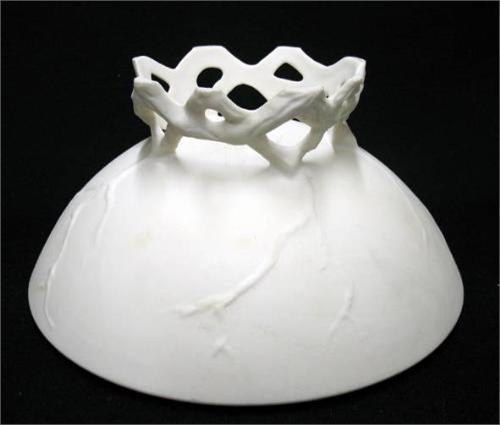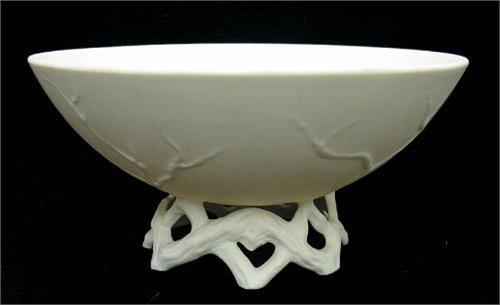 Boehm porcelain bowl on attached intertwined twig form base, twig design extends upward onto exterior of bowl; mid to late 20th C.; 4 1/4" high x 8 1/2" diameter (no visible defects)