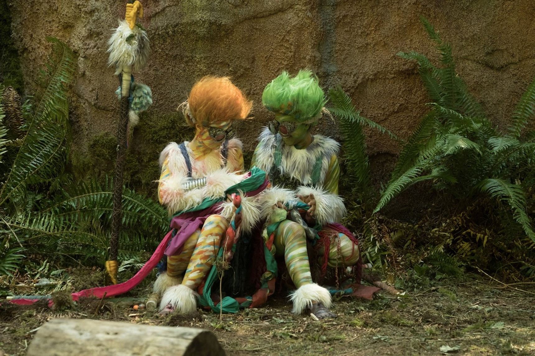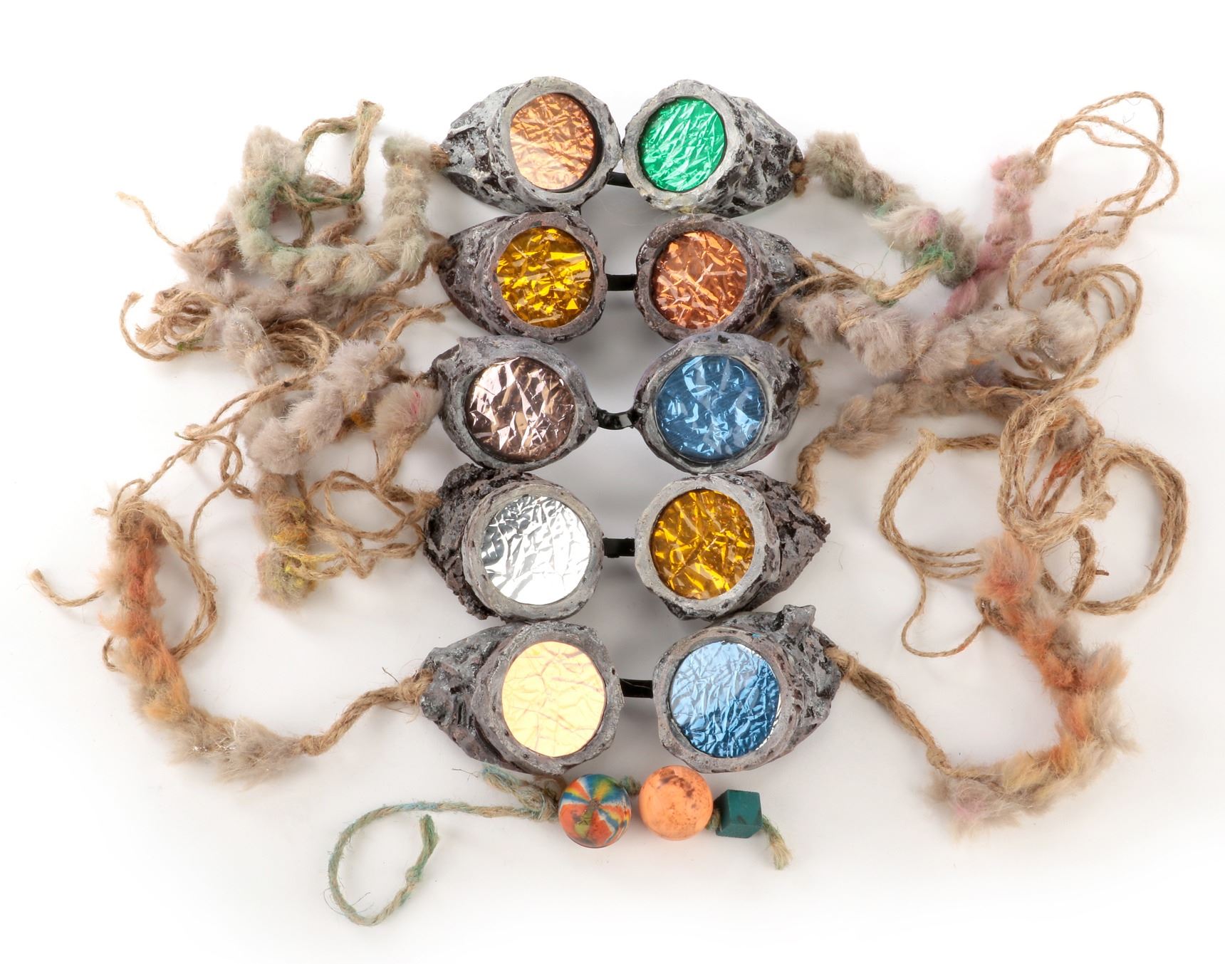 117. "Bofuki Nepoo" signature goggles from Dirk Gently's Holistic Detective Agency. (BBC America, 2016-2017) Collection of (7) pairs of character goggles constructed of hard plastic with craggy resin coating expertly studio painted to appear as rock. Each pair is outfitted with compound lenses sandwiching a translucent colored gel and strands of twine woven with faux fur for attachment to wearer. Some of the most unique residents of Wendimoor, the Bofuki Nepoo dwell in the forest with the witch Wakti Wapnasi. Exhibiting some paint chipping and production wear. In generally very good condition. Starting Bid: $25