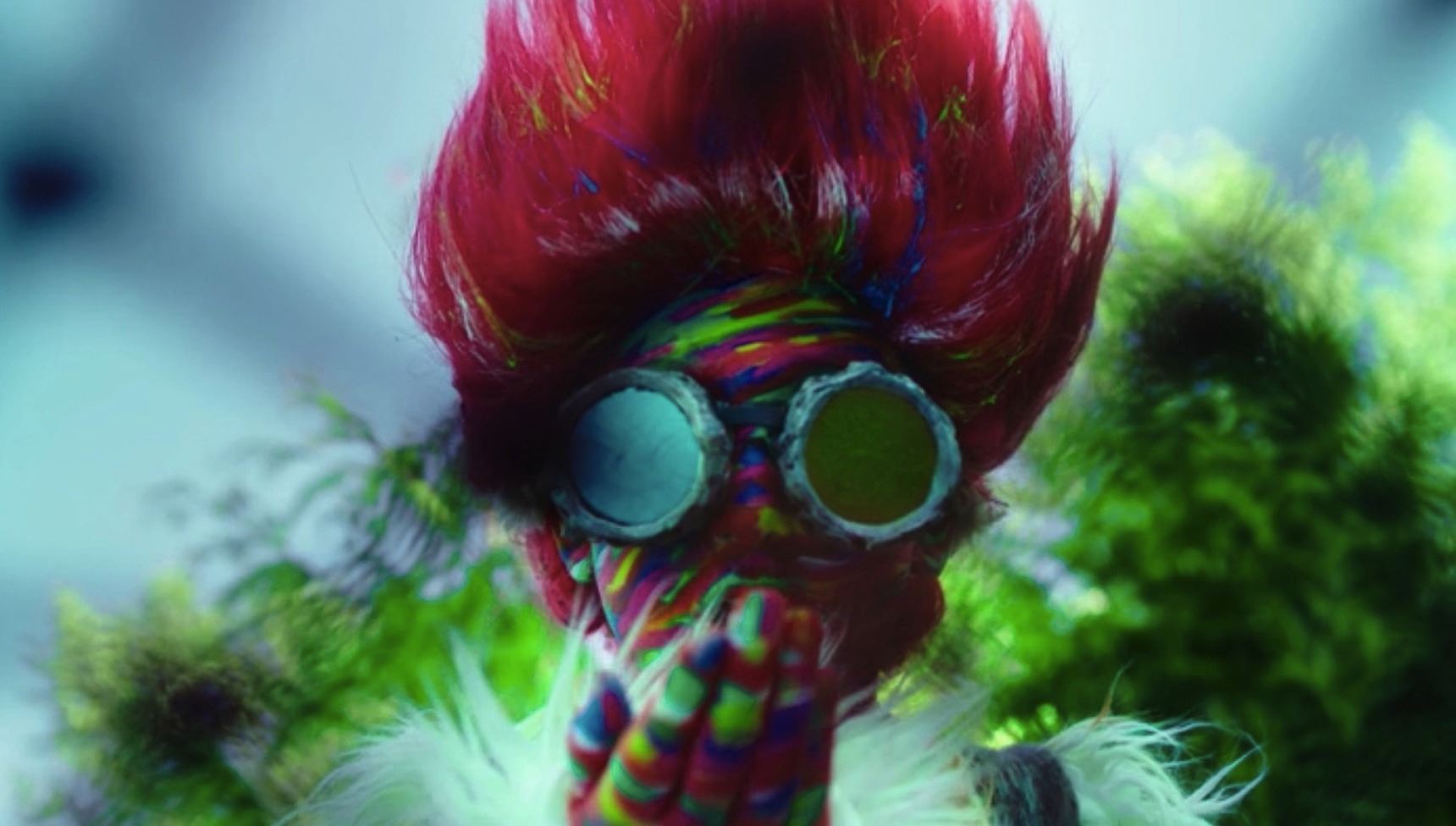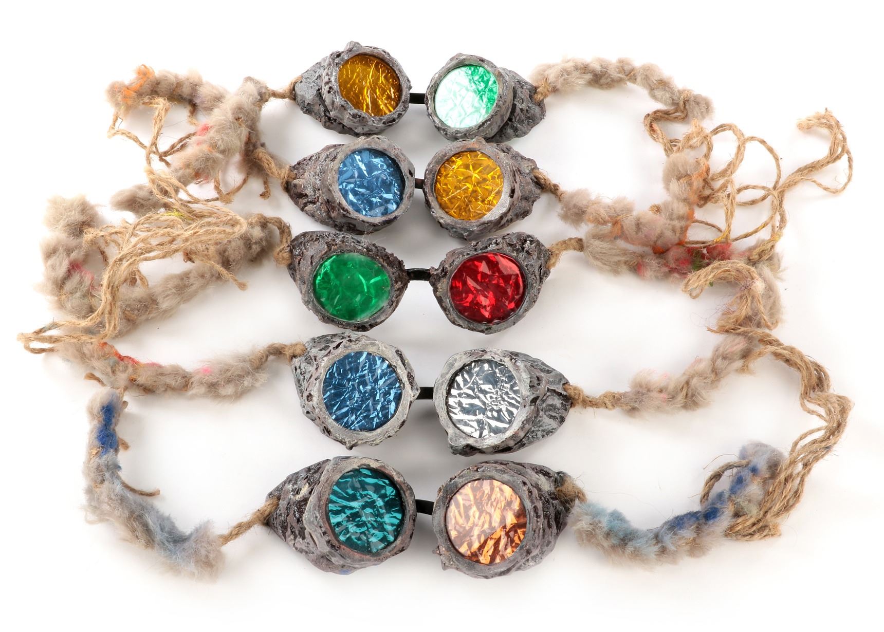 120. "Bofuki Nepoo" signature goggles from Dirk Gently's Holistic Detective Agency. (BBC America, 2016-2017) Collection of (5) pairs of character goggles constructed of hard plastic with craggy resin coating expertly studio painted to appear as rock. Each pair is outfitted with compound lenses sandwiching a translucent colored gel and strands of twine woven with faux fur for attachment to wearer. Some of the most unique residents of Wendimoor, the Bofuki Nepoo dwell in the forest with the witch Wakti Wapnasi. Exhibiting some paint chipping and production wear. In generally very good condition. Starting Bid: $25