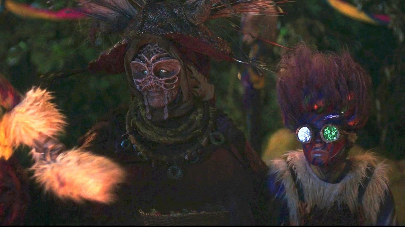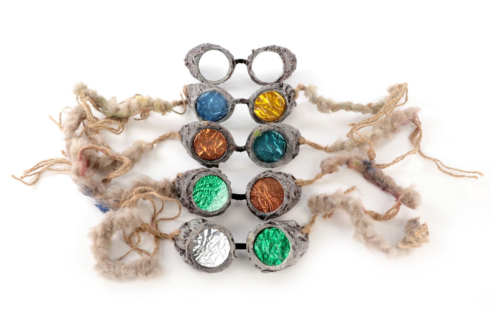122. "Bofuki Nepoo" signature goggles from Dirk Gently's Holistic Detective Agency. (BBC America, 2016-2017) Collection of (4) pairs of character goggles constructed of hard plastic with craggy resin coating expertly studio painted to appear as rock. Each pair is outfitted with compound lenses sandwiching a translucent colored gel and strands of twine woven with faux fur for attachment to wearer. Also includes (1) pair of frames without lenses or ties. Some of the most unique residents of Wendimoor, the Bofuki Nepoo dwell in the forest with the witch Wakti Wapnasi. Exhibiting some paint chipping and production wear. In generally very good condition. Starting Bid: $25