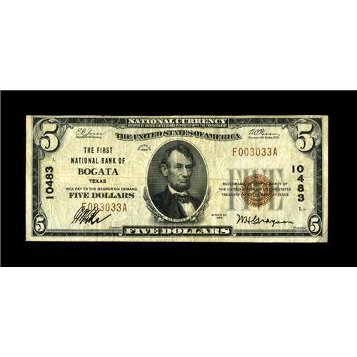 <B>Bogata, TX</B></I> - $5 1929 Ty. 1 <B>The First NB</B></I> Ch. # 10483<BR>A considerably nicer than normally seen small note from this tougher east Texas bank. <B>Fine+++.</B></I><BR><BR><b>Shipping:</b> Coin/Currency (<a target="_blank" href="http://www.heritageauctions.com/common/shipping.php">view shipping information</a>)