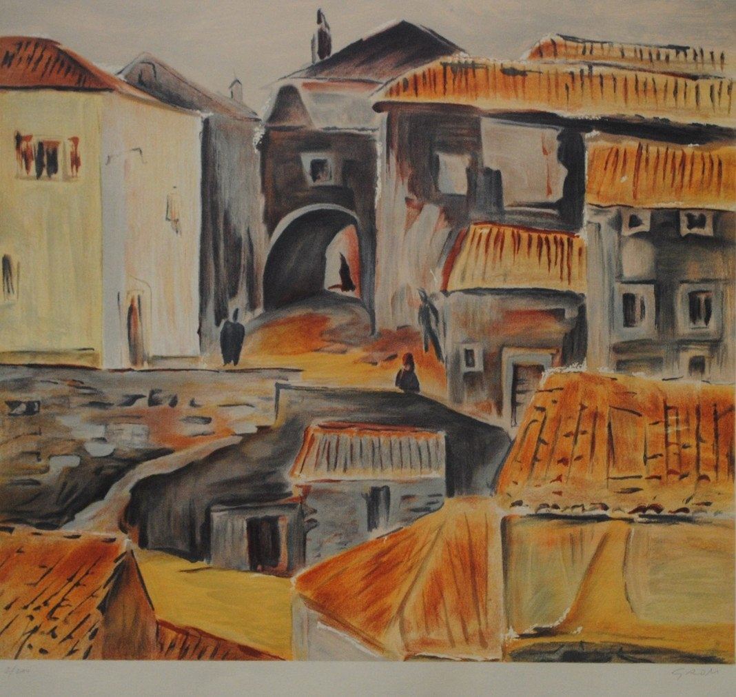 Bogdan Grom's "The Village" lithograph signed and numbered 2/200. This lithograph is in excellent condition and has never been framed. Image- 19" x 21"
