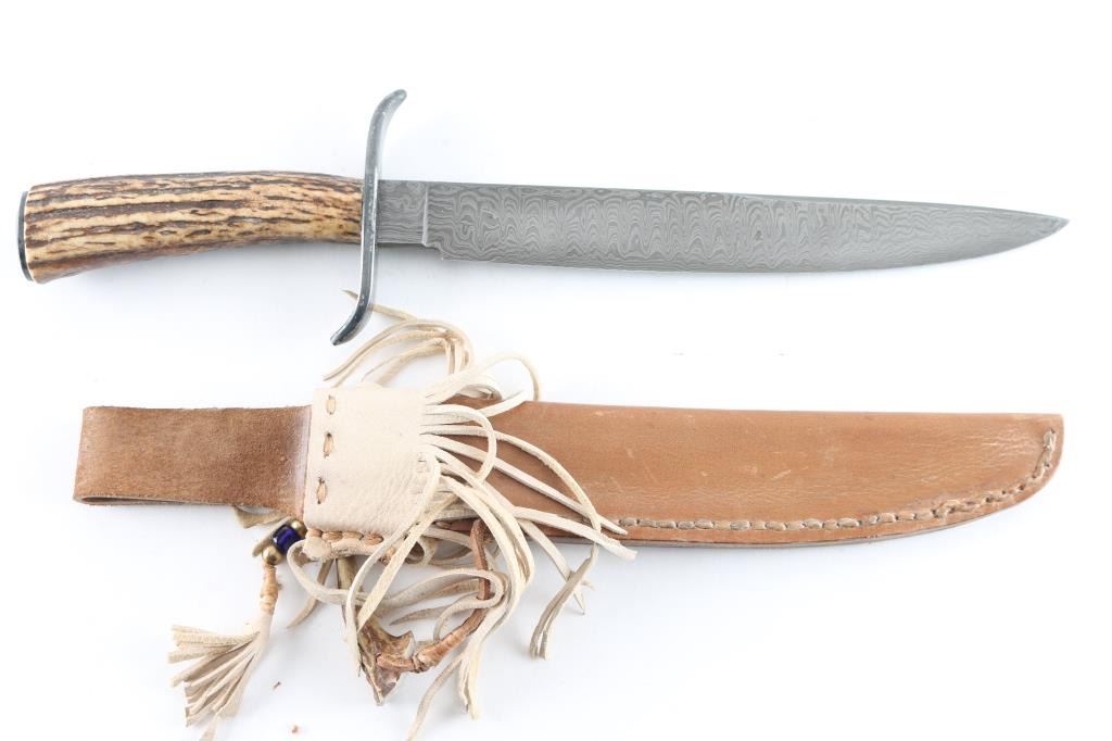 14.5" overall, antler handle, leather sheath. Blade marked "BOGGS H.F.". Very good condition.