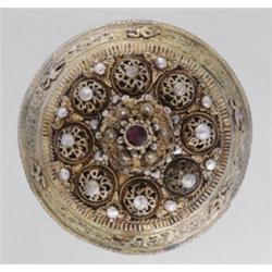 17. sz., fémjel nélkül, aranyozott ezüst, öntött virágmintás díszítmények, köralakú és golyós rátétekkel, középen piros üvegköves zárt foglalással, csavartdrótos kereteléssel, 208,1 g; d: 11,5 cm