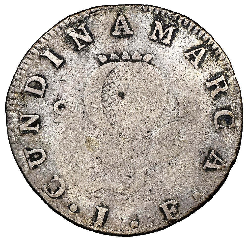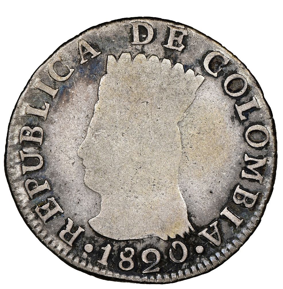 Bogota, Colombia, 2 reales, 1820JF, Cundinamarca, dots in legend, NGC F 12, finest and only example in NGC and PCGS censuses, ex-Eldorado (stated on label). Restrepo-155.1; KM-C5. Very bold legends enhanced by dark toning, centers weakly struck as usual, but overall quite nice for the grade and type ("very scarce" in Restrepo), the only example listed at either NGC or PCGS as the listing in the latter census is this same coin, now crossed over. NGC #5936656-016. Pedigreed to the Esmeralda Collection (stated on special label) and to the Eldorado Collection (Stack's Bowers auction of August 2018, lot 42374).