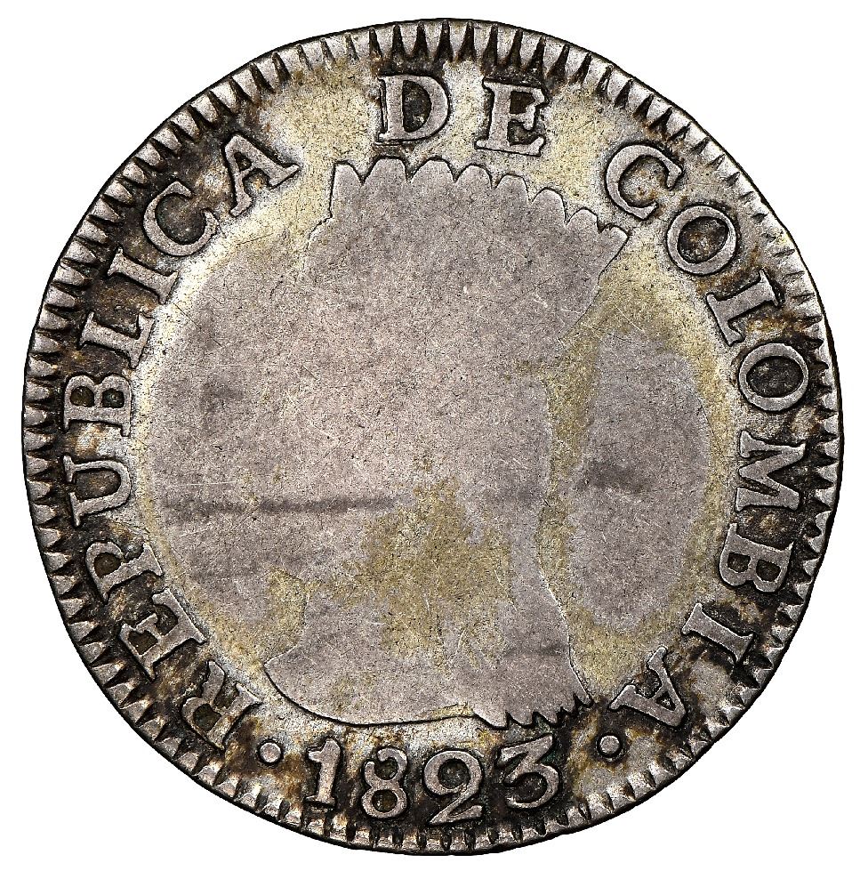 Bogota, Colombia, 2 reales, 1823JF, Cundinamarca, very rare, NGC VG 8, finest and only example in NGC census, ex-Dana Roberts (stated on label). Restrepo-155.8; KM-C5. Very rare final date of Cundinamarca coinage, whose dies had deteriorated to the point that the centers of this coin are nearly flat while the legends are almost pristine (with luster, even), nicely toned all over, visually superior to the Eldorado specimen at the same grade (PCGS), which is the only other example sold publicly in recent years. NGC #5937428-005. Pedigreed to the Esmeralda Collection (stated on special label) and to the Dana Roberts collection (Heritage auction of April 2011, lot 25490).