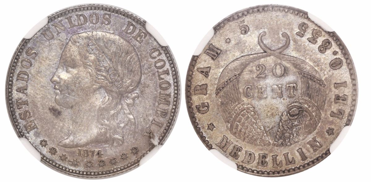 Bogota, Colombia, 20 centavos, 1874, "GRAM. 5" variety, encapsulated NGC AU 58, with WINGS silver sticker, finest known in NGC census. Well struck with lovely old rainbow toning, faint old hairlines to keep it from MS grade. Acquired from Alvaro Gonzalez, ca. 1973-1975.