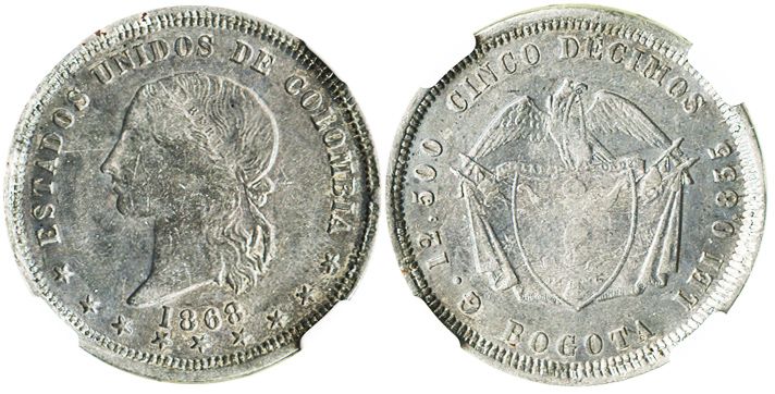 Bogota, Colombia, 5 decimos, 1868, encapsulated NGC AU 50, finest known graded by NGC, rare first date of issue. Restrepo-293.1; KM-153.1. Lightly toned, with underlying luster, slightly weakly struck in centers as usual (which is why this AU 50 is the finest known), the denomination mislabeled in the slab as 50C (but correctly attributed in the online census). The "half dollars" of independent Colombia--a very popular series with collectors--effectively began with this date, for no prior coins of this size were struck after colonial times unless you include the unique and controversial 4 reales of 1819.