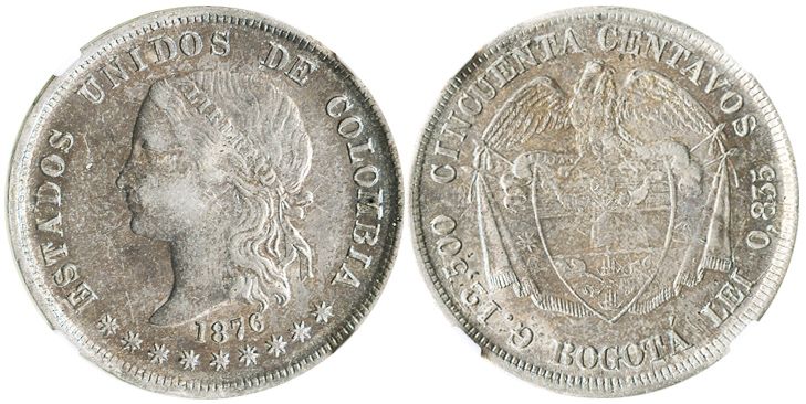 Bogota, Colombia, 50 centavos, 1876, encapsulated NGC AU 55, finest known graded by NGC.