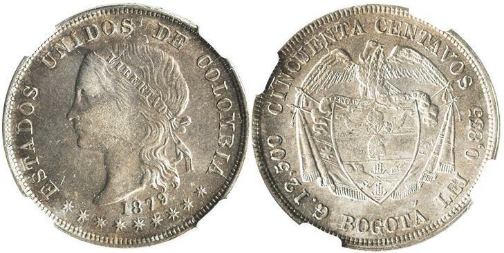 Bogota, Colombia, 50 centavos, 1879/1879, encapsulated NGC AU 58.