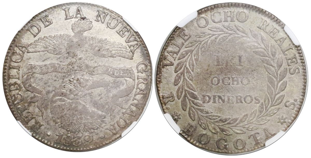 Bogota, Colombia, 8 reales, 1839RS, encapsulated NGC AU 58. Restrepo-194.1; KM-98. First year of issue, unusual quality for the series with underlying luster, nice old toning, among finest listed in the NGC census.