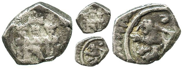 Bogota, Colombia, cob 1/4 real, Philip IV, style of 1628, rare. Restrepo-M14.1; S-B4; CT-Type 276. 0.9 gram. Full castle, nearly full but off-center lion, both with enough detail to match them up with the 8R of 1628 (erroneously attributed to 1652 in Restrepo), typically small flan, nicely toned AVF. With dealer tag pedigreeing the coin to Nesmith 1958 ANS publication (p. 523) and Freeman Craig pricelist of July 1976 (item #315).