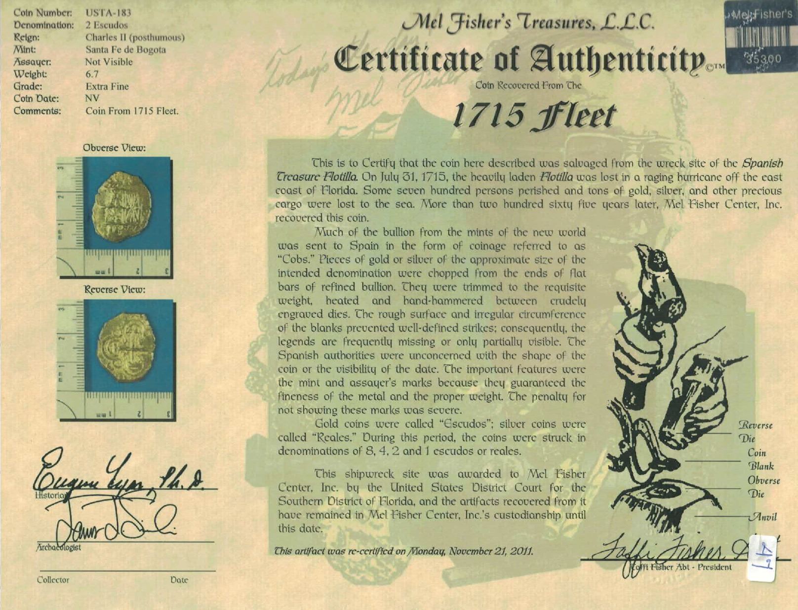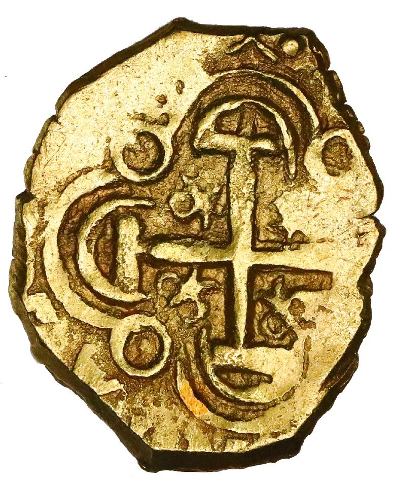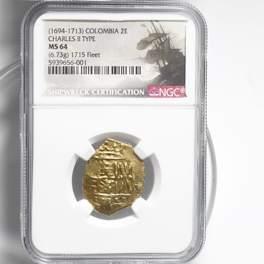 Bogota, Colombia, cob 2 escudos, Charles II posthumous, no assayer (Arce), NGC MS 64, ex-1715 Fleet (designated on special label). Restrepo-M66.32; S-B24; KM-14.2; Cal-Type 242. 6.75 grams. Broad and somewhat oval-shaped flan with nearly full shield and cross, lustrous and choice, rusty-die reverse. NGC #5939656-001. From the 1715 Fleet, with Fisher photo-certificate #USTA-183.