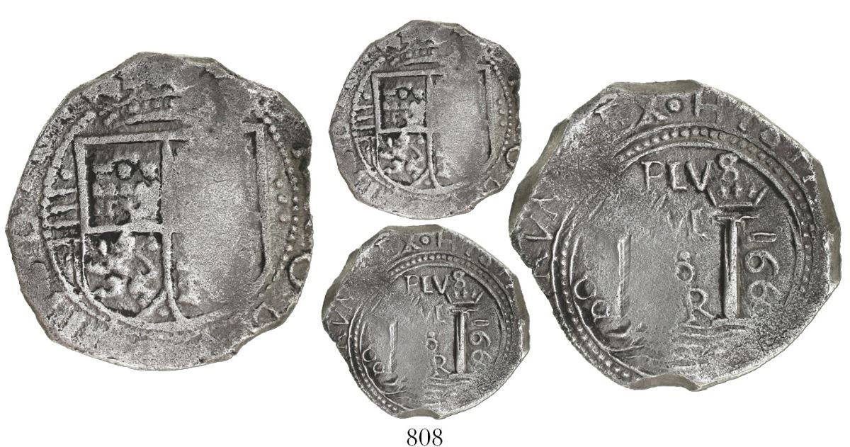 Bogota, Colombia, cob 4 reales, 1669, assayer PoR, extremely rare (unlisted), ex-Seville harbor (ca. 1671). Restrepo-M60.1 (date not listed); S-B7a; KM-unl. (cf. 11); CT-unl. 13.17 grams. Bold full 166 of date with weak but certain 9, bold Po of assayer but very weak R, good but partially flat pillars and shield, the latter with full •IIII• denomination to left, vertical ••• to right, parts of king's name in legend, minimal corrosion, typically lightly toned with black around some details, first specimen we have heard of and unprecedented as from this wreck. From an unidentified ca.-1671 wreck in Seville harbor.