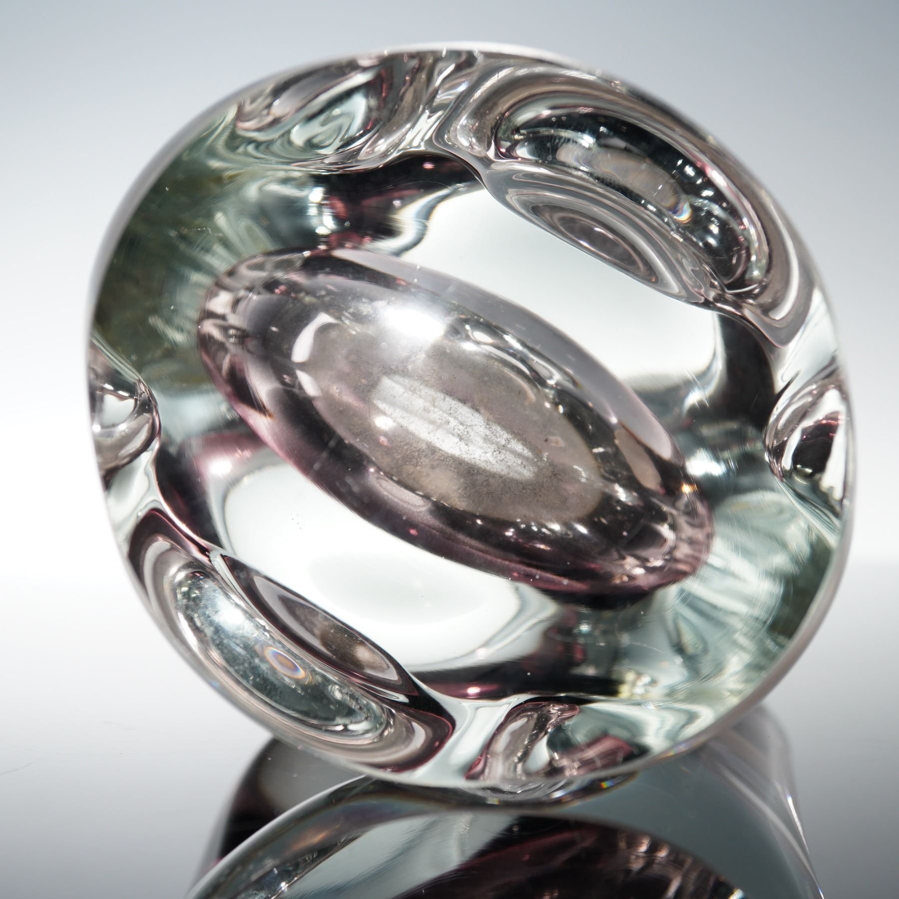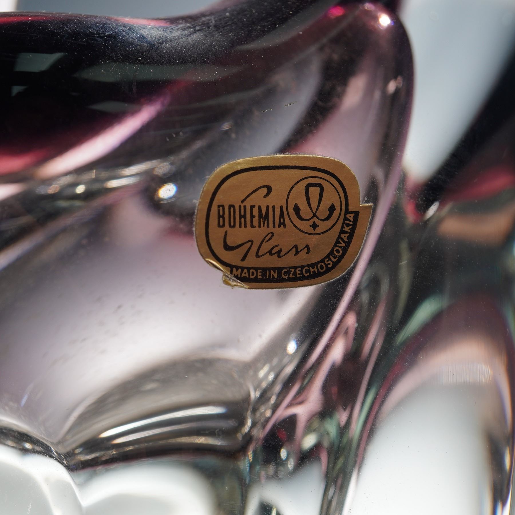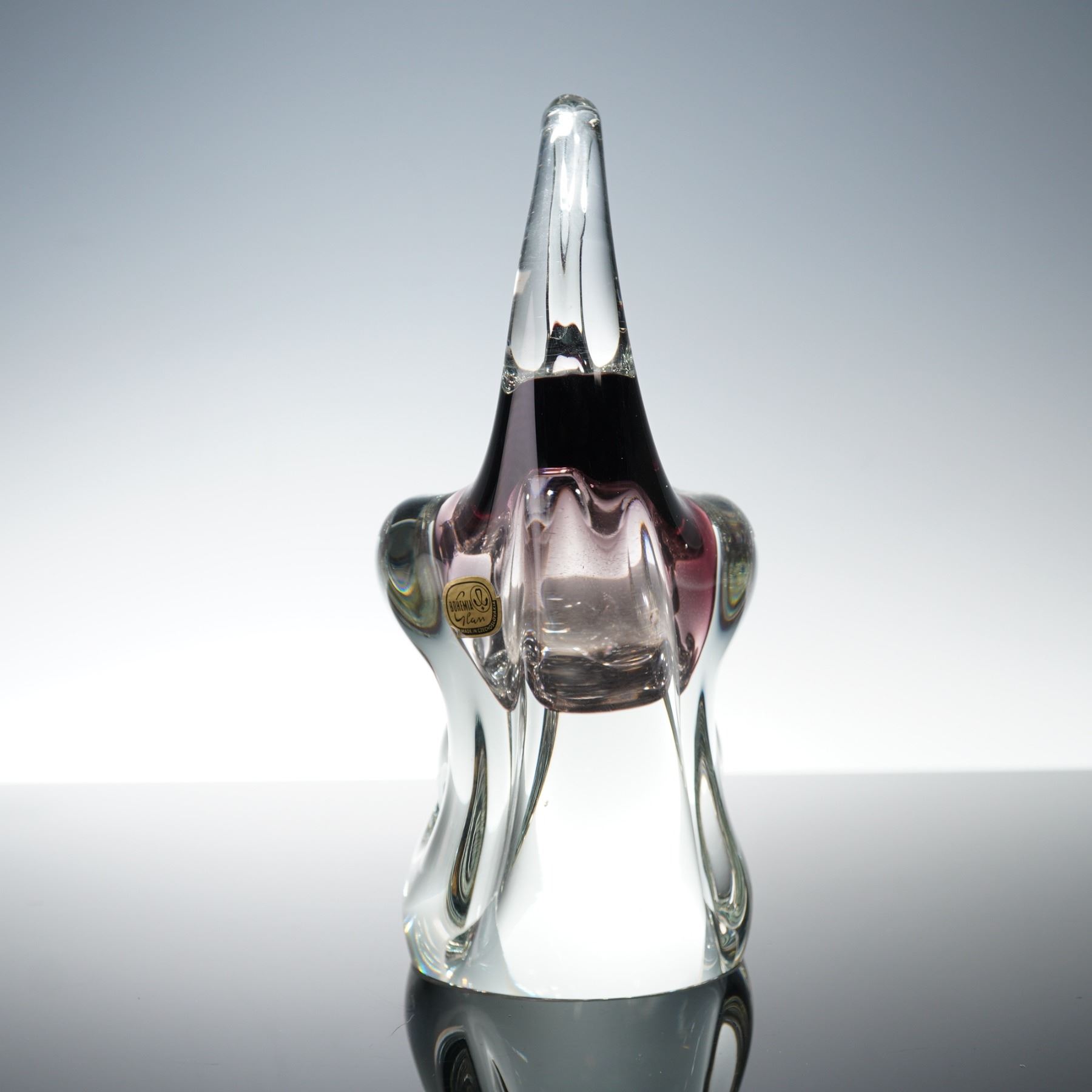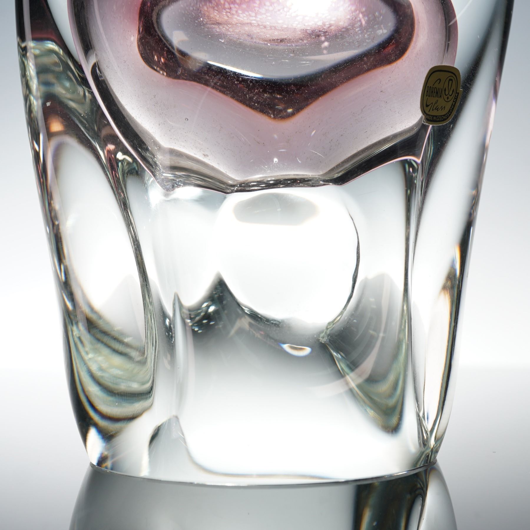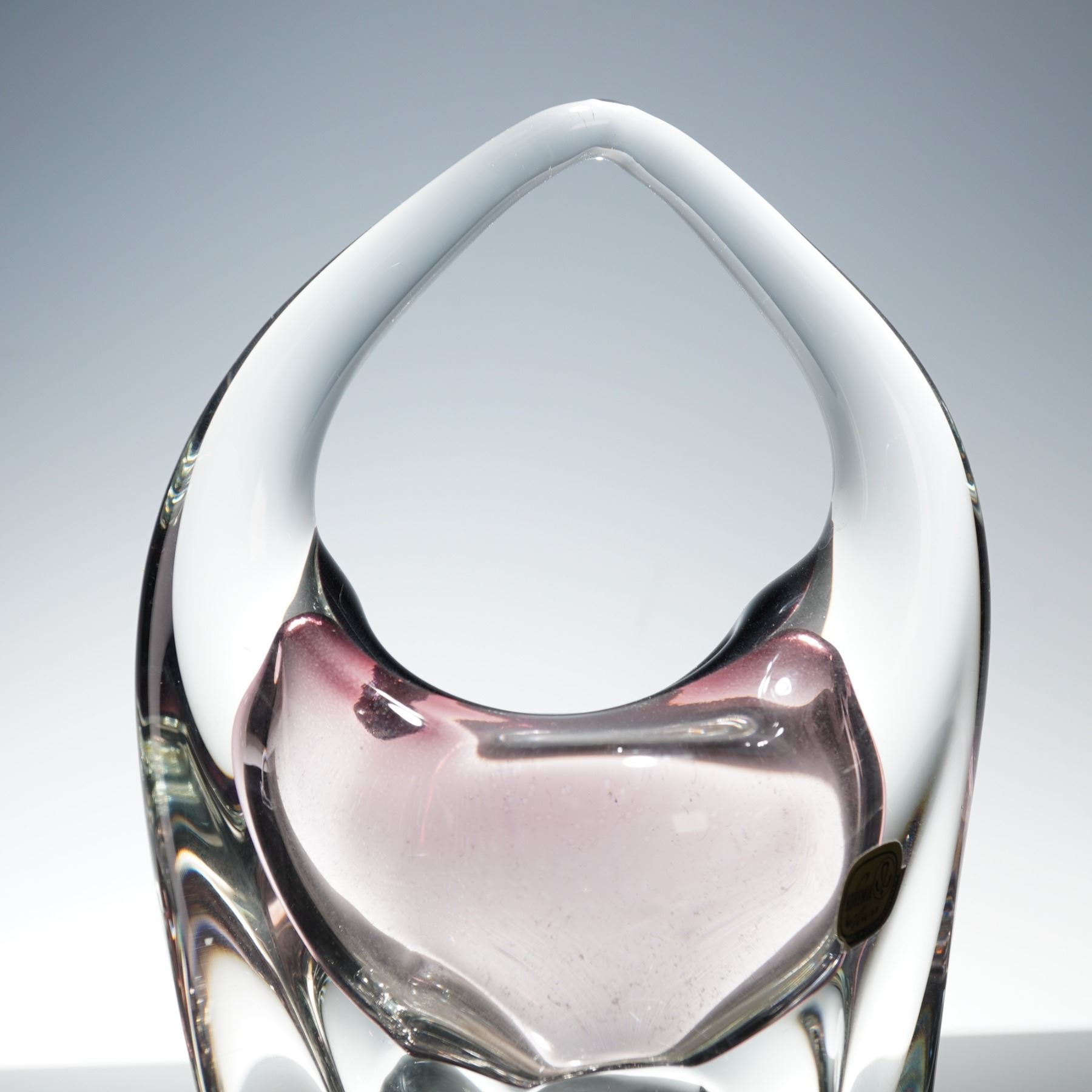 A vintage Bohemia art glass basket vase, made in Czechoslovakia. The sculptural form features a looped handle design with heavy clear crystal walls encasing a soft amethyst interior. The piece exhibits the distinctive optical clarity and craftsmanship characteristic of mid-century Bohemian glassmaking. Retains original Bohemia Glass Made in Czechoslovakia foil label.