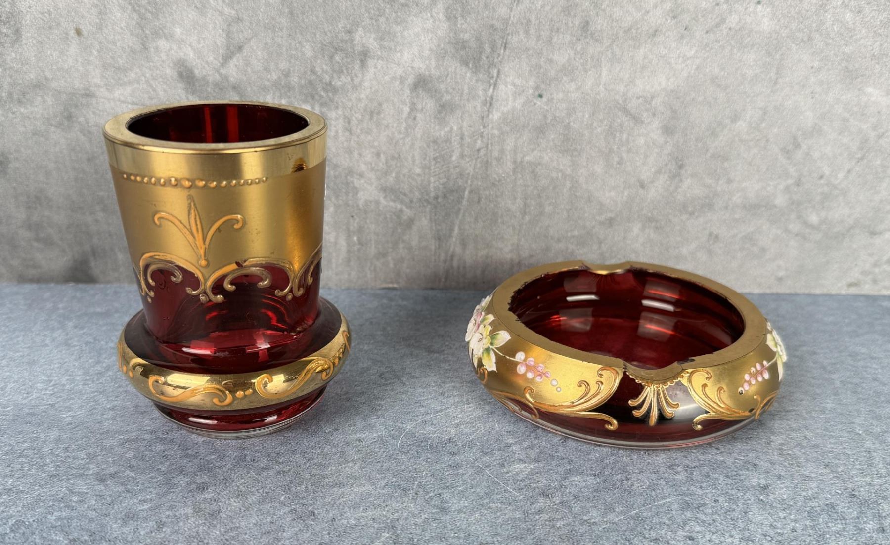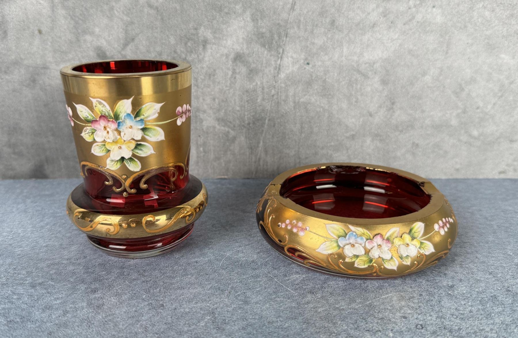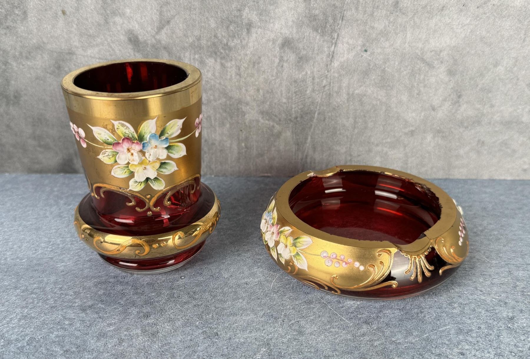 Two pieces. Cigarette holder is 3 1/2" tall by 2 3/4" in diameter and ashtray is 1" tall by 3 3/4" in diameter.