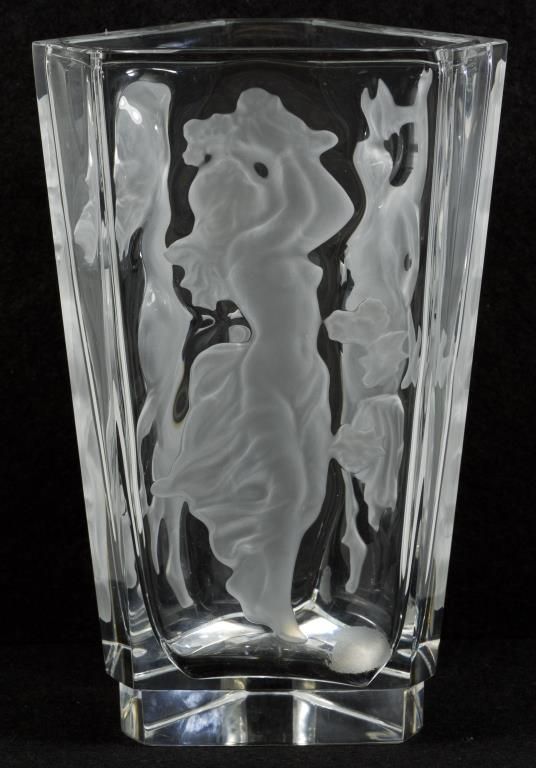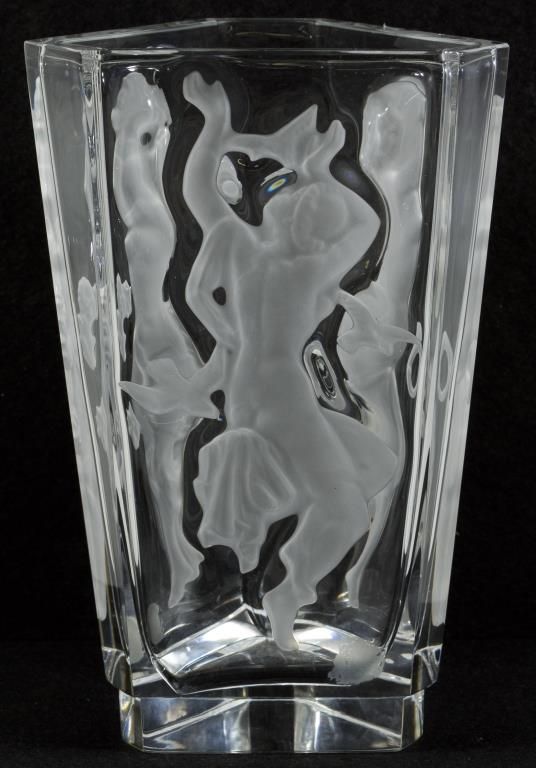 Bohemia Czech Republic Art Deco Style Three Sided Nude Figurine Vase, Bohemia Czech Republic Art Deco Style Three Sided Nude Figurine Vase | Features Frosted Reverse Cut Sharp Line Nude Figurines | DIMENSIONS: Height 8 1/2 inches | CONDITION: Excelle