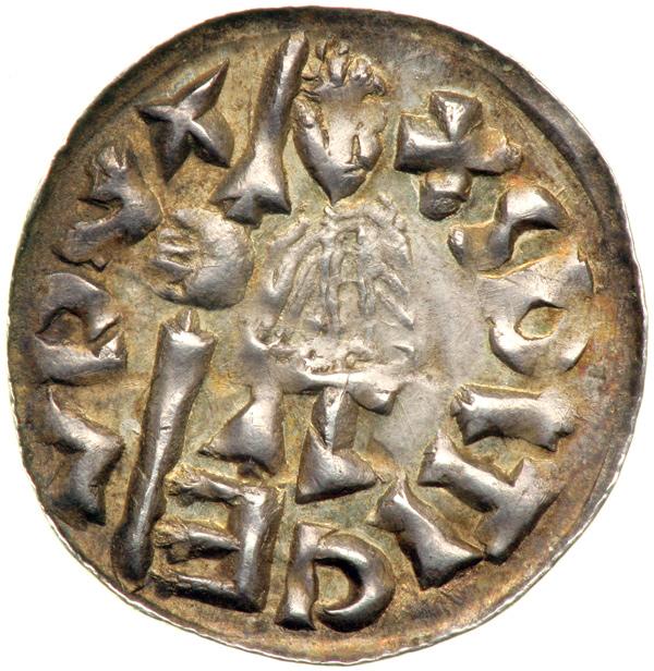 Bohemia. Denar, ND. Cach-330. Weight 0.81 grams. Prague mint. Spytihnew II, 1055-1061. Obverse: Standing monarch with spear in right hand. Legend: +SPITICEV DVX Reverse: Standing Saint with cross in right hand. Legend: SCS W - ENCEZS. As struck with lovely toning and luster. Uncirculated.