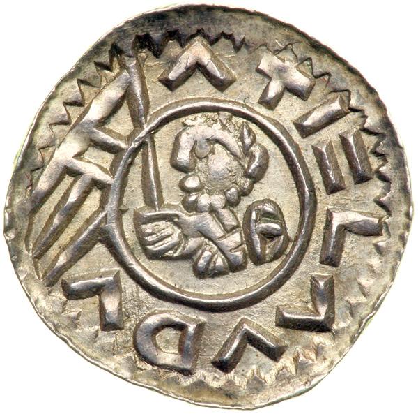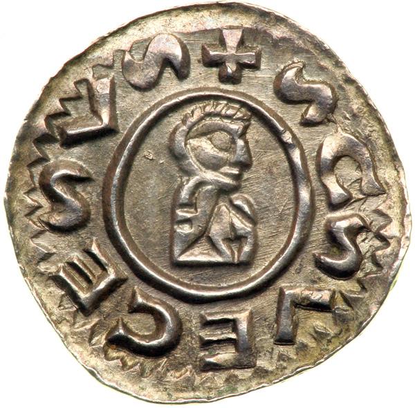 Bohemia. Denar, ND. Cach-346. Weight 0.81 grams. Prague mint. Wratislaus II, 1061-1092. Obverse: Bust portrait right, with banner and pole, right, integrated into design. Legend: ATIZLADV Reverse: Bust portrait, right. Legend: + SCSVECESVS. Sharply struck, toned and lustrous. Virtually as struck. About Uncirculated.