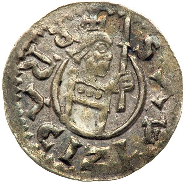 Bohemia. Denar, ND. Cach-388. Weight 0.61 grams. Prague mint. Bretislaus II, 1092-1100. Obverse: Enthroned bust holding lance within inner circle. Legend: + BRACIZLAVS. Reverse: Bearded head facing front with no pellets. Legend: + SWENCEZLAVS. A sharp lustrous example. About Uncirculated.