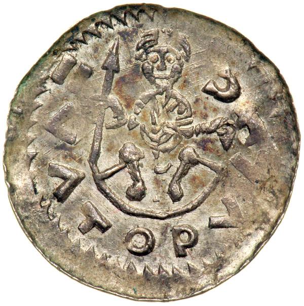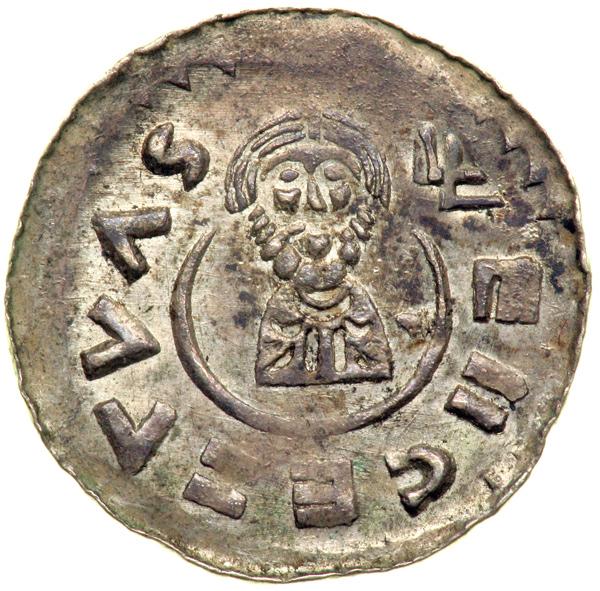 Bohemia. Denar, ND. Cach-425. Weight 0.67 grams. Olmutz mint, 1095-1107. Svatopluk of Moravia, 1095-1109. Obverse: Seated ruler with spear in right hand and wedge in left hand - sitting on spoked arc. Legend: VATOPULC Reverse: Bust of Saint in half circle. Legend: WEIICE Z LAUS. Lustrous. About Uncirculated.