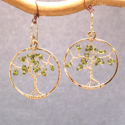 Metal: Gold Hammered circles with a "tree" of peridot wrapped around inside, about 1-1/2" long. Available in either 14K gold-filled, rose gold-filled, or sterling silver. All jewelry is entirely handmade in our studio in New York.