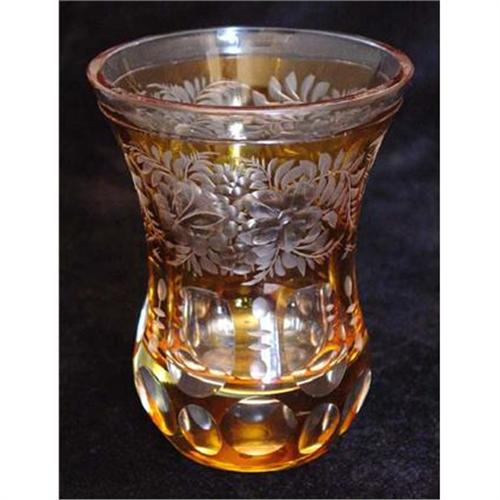 Bohemian drinking glass / goblet in amber color glass decorated with flowers and medallions. In good used condition with minor signs of wear. Please ask questions, request additional photos and shipping costs before bidding.