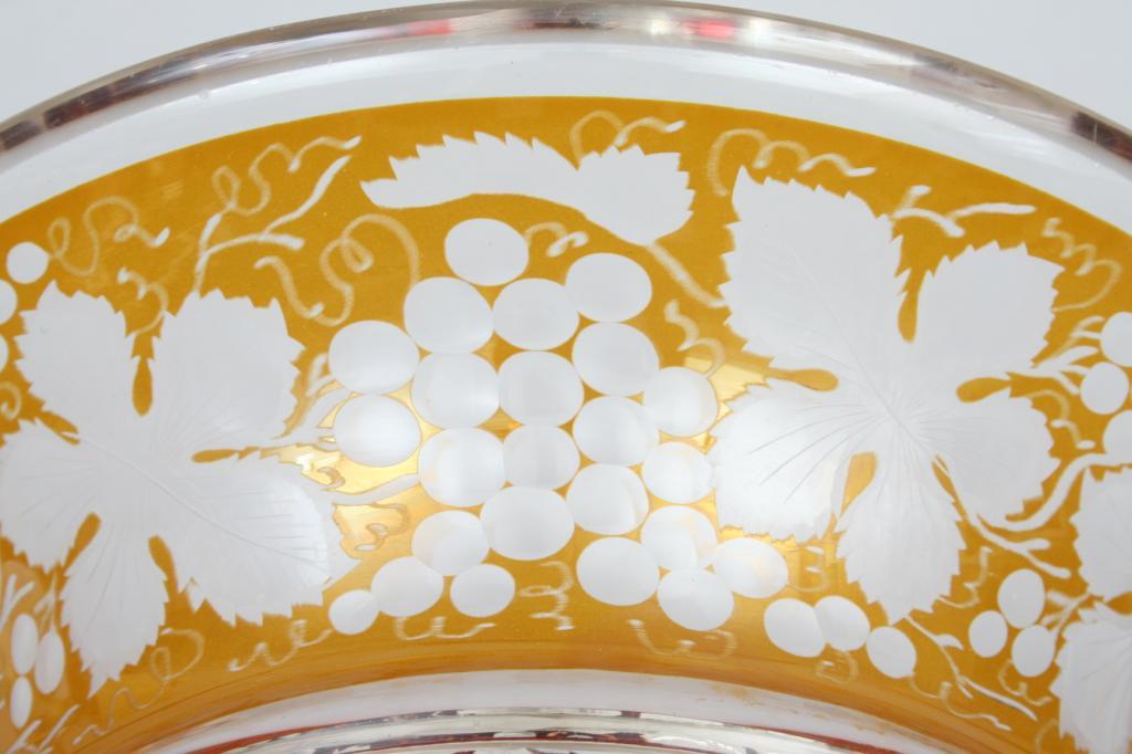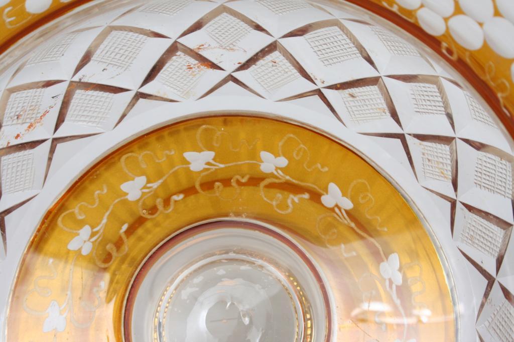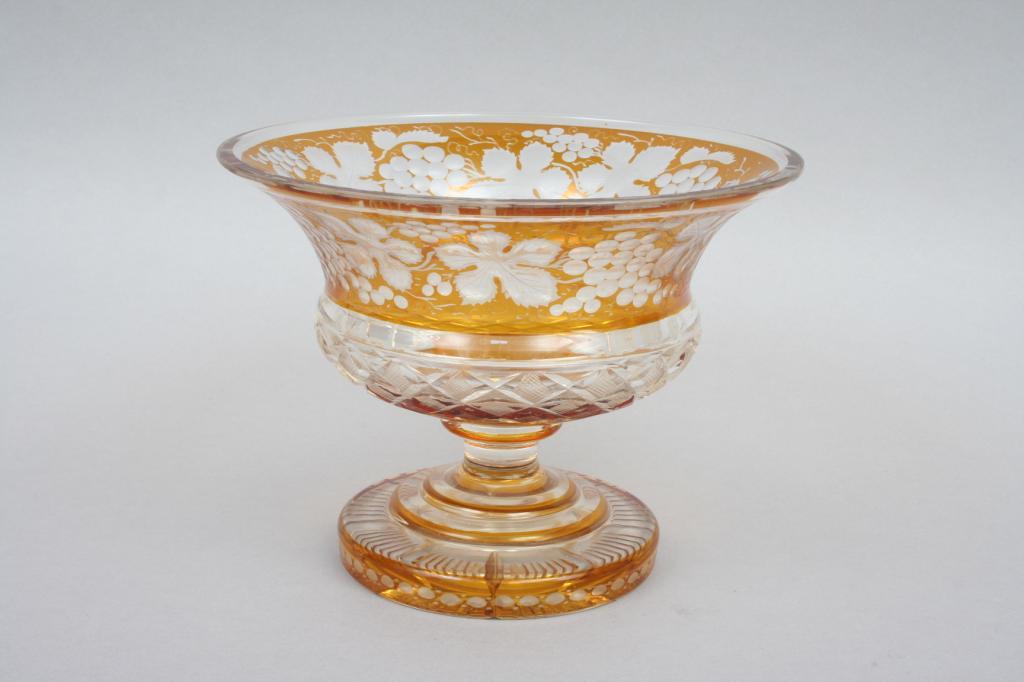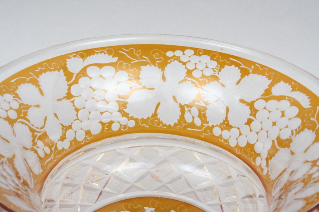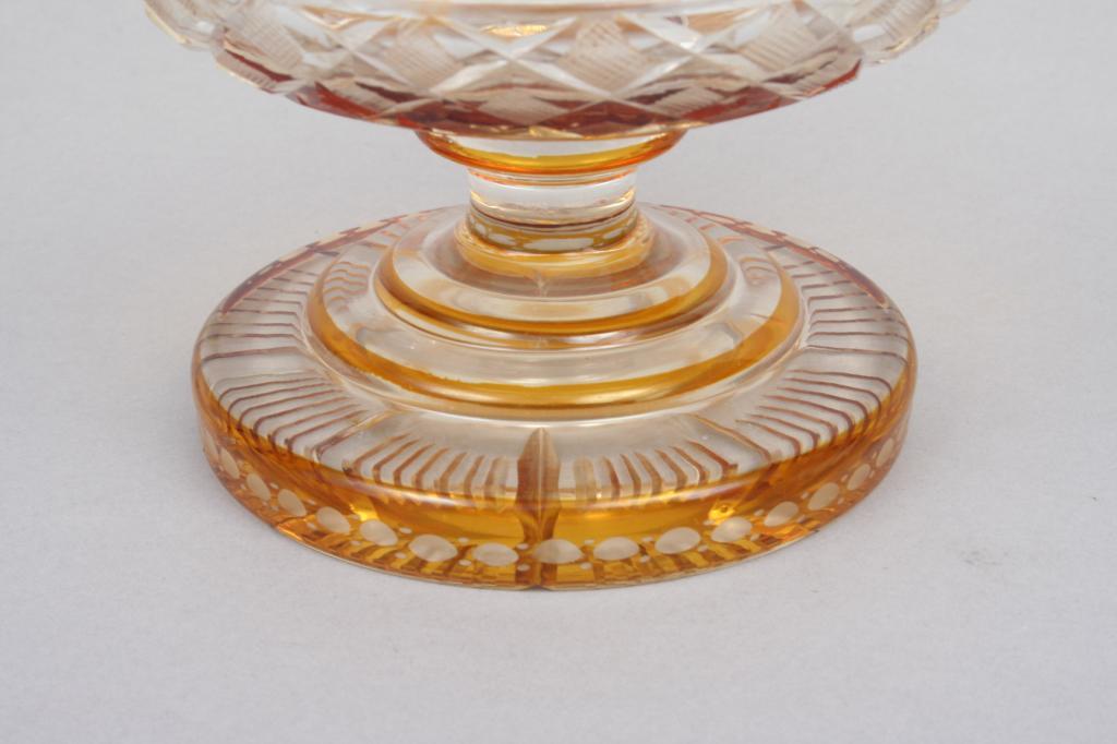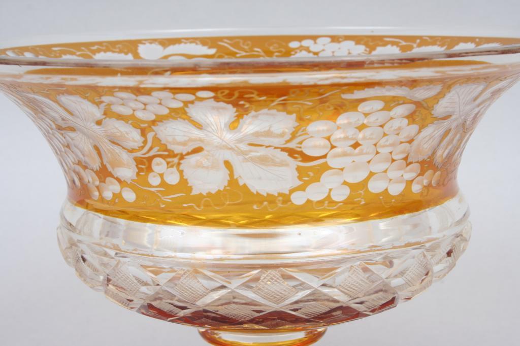 Late 19th or early 20th century, possibly Moser, blown in amber glass cut to clear with fruiting vine motif, the body faceted with diamonds, raised on a round foot, unsigned. 6 7/8"H. 9 1/4"D. Condition: tiny flake to top of foot, some light scratches throughout, otherwise good.