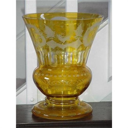 A very large, early 20th century, Bohemian etched glass vase, 11" tall, 9" top diameter. The vase is clear glass cased with a thin layer of amber and the design is etched through the amber revealing the clear glass underneath. The vase is beautiful and its' large size will make it an eye catcher empty or full of flowers. The condition is very good, there are two or three very tiny dings to the rim but there are no chips or cracks. (5)