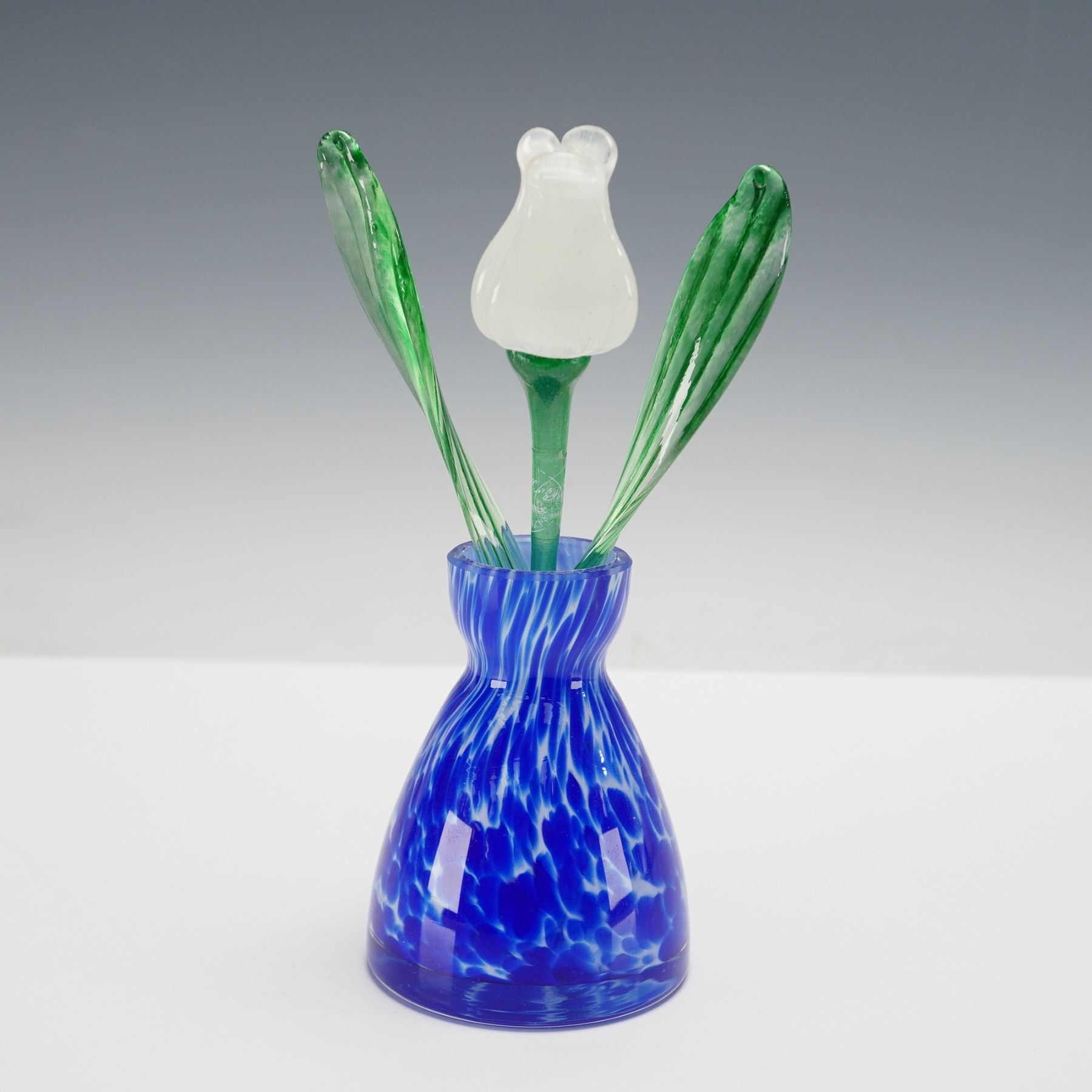 A decorative art glass composition from the Czech Republic that features a hand-blown white tulip with two textured green leaves. The florals are presented in a vivid cobalt blue vase adorned with a mottled, water-like pattern. The stem of the flower bears an illegible stickered labeled, marked with "Made in Czech Republic".