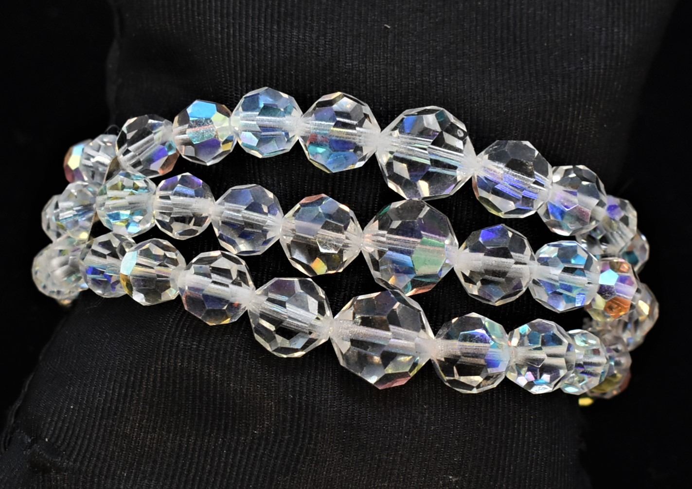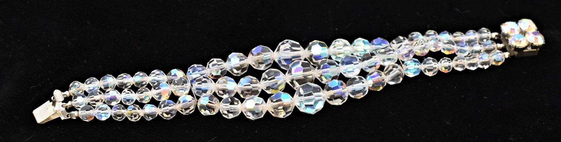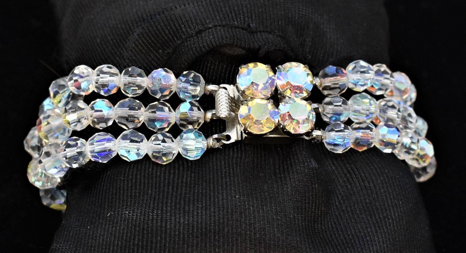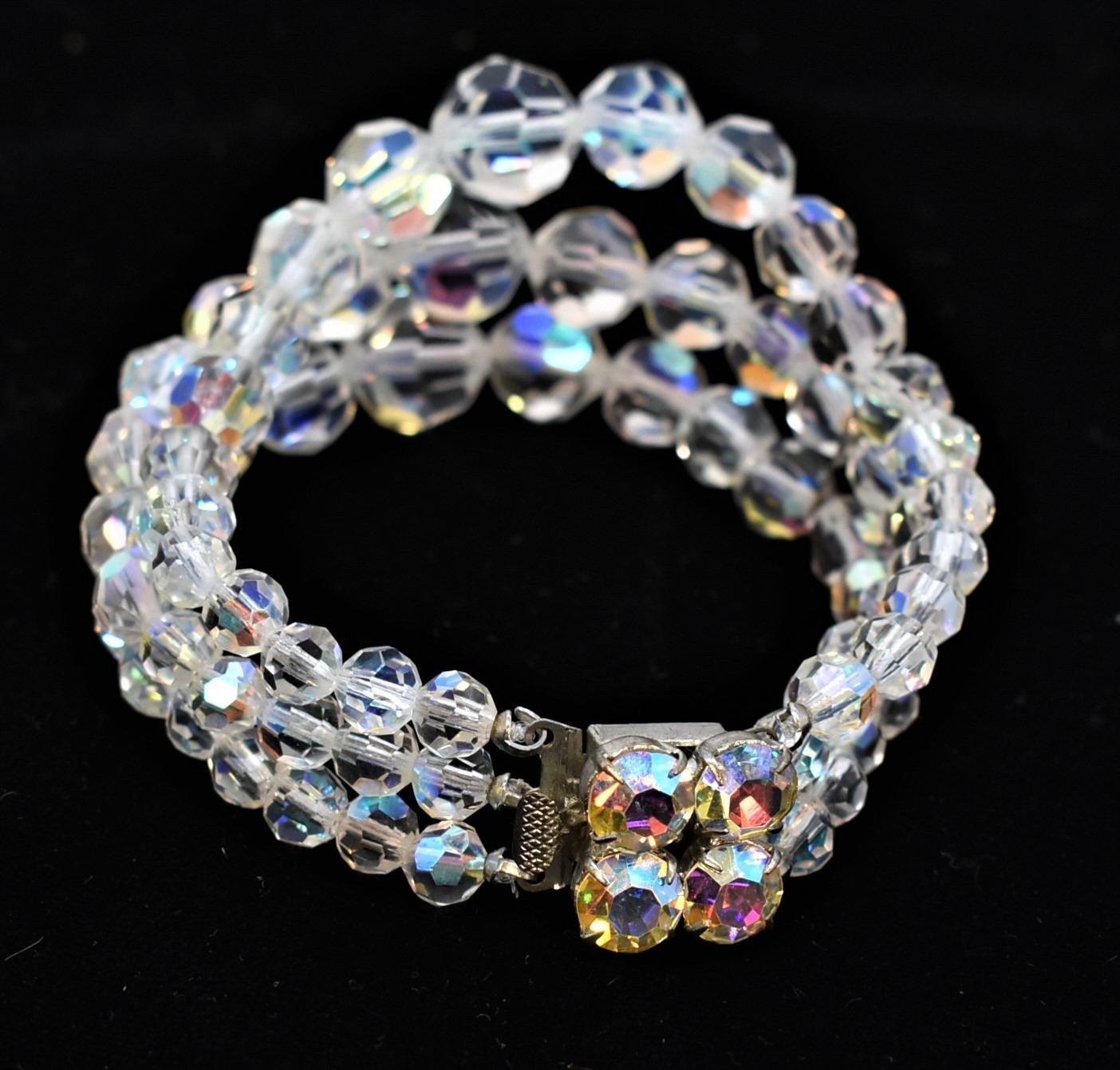 Vintage Estate Bohemian 3 Strand Aurora Borealis Crystal Bracelet, measures 8''L end to end x 1.5''W, hidden clasp closure