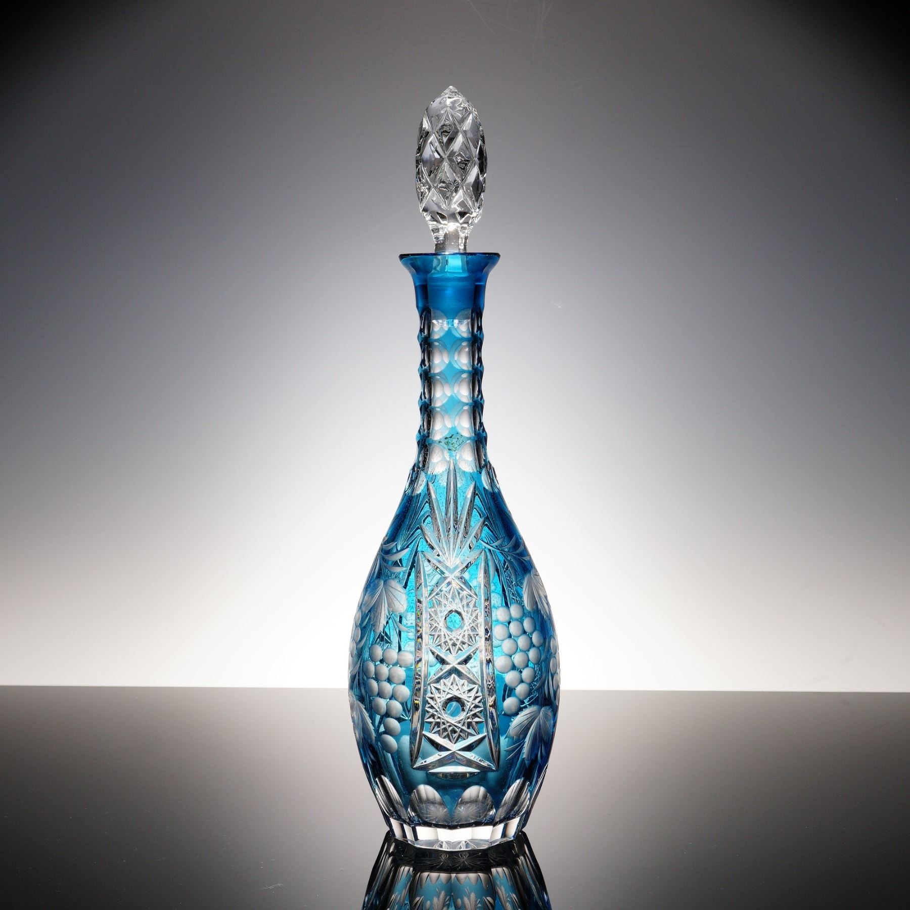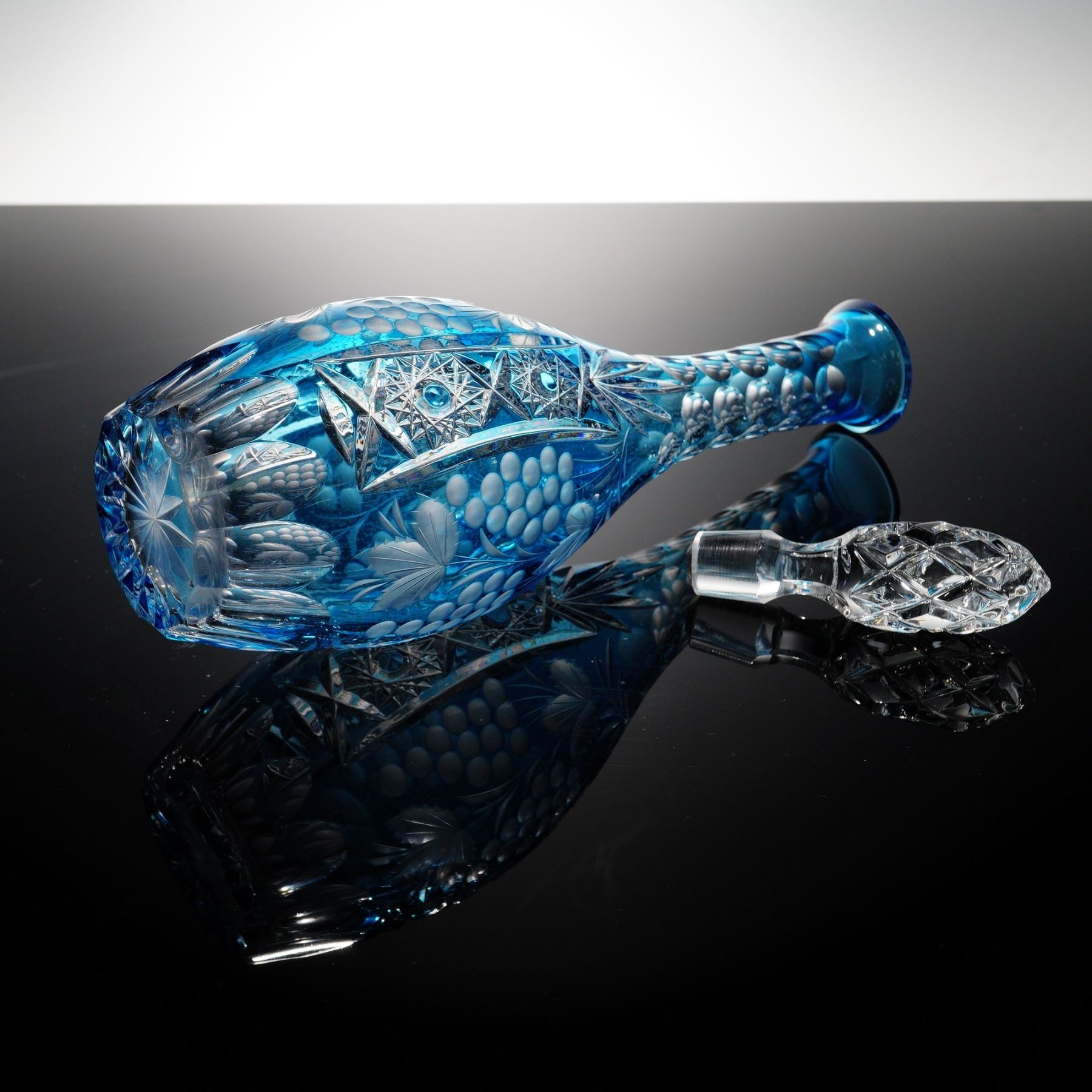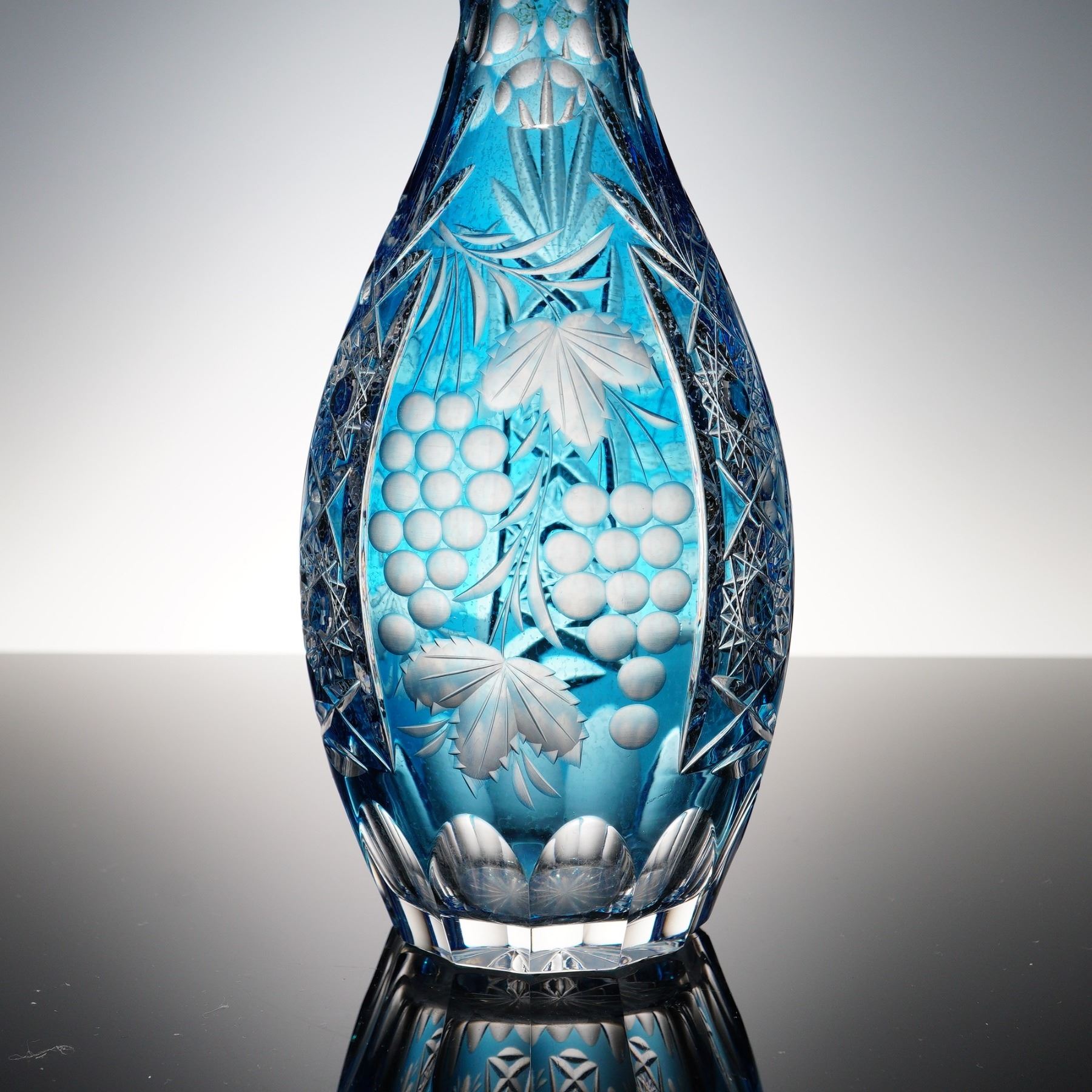 A striking Bohemian cut-to-clear crystal decanter in a vivid blue overlay, featuring an elegant teardrop form and an elaborately faceted stopper. The body is richly adorned with acid-etched grape clusters and vine leaves in frosted relief, framed by deep wheel-cut starbursts and vertical panels of geometric crosshatching. The tall neck is decorated with clear oval lens cuts and flares gently into a wide rim. The pineapple-shaped stopper is finely faceted and fits snugly. Unmarked, likely Czechoslovakia, mid-to-late 20th century. In excellent condition with no chips or cracks.
