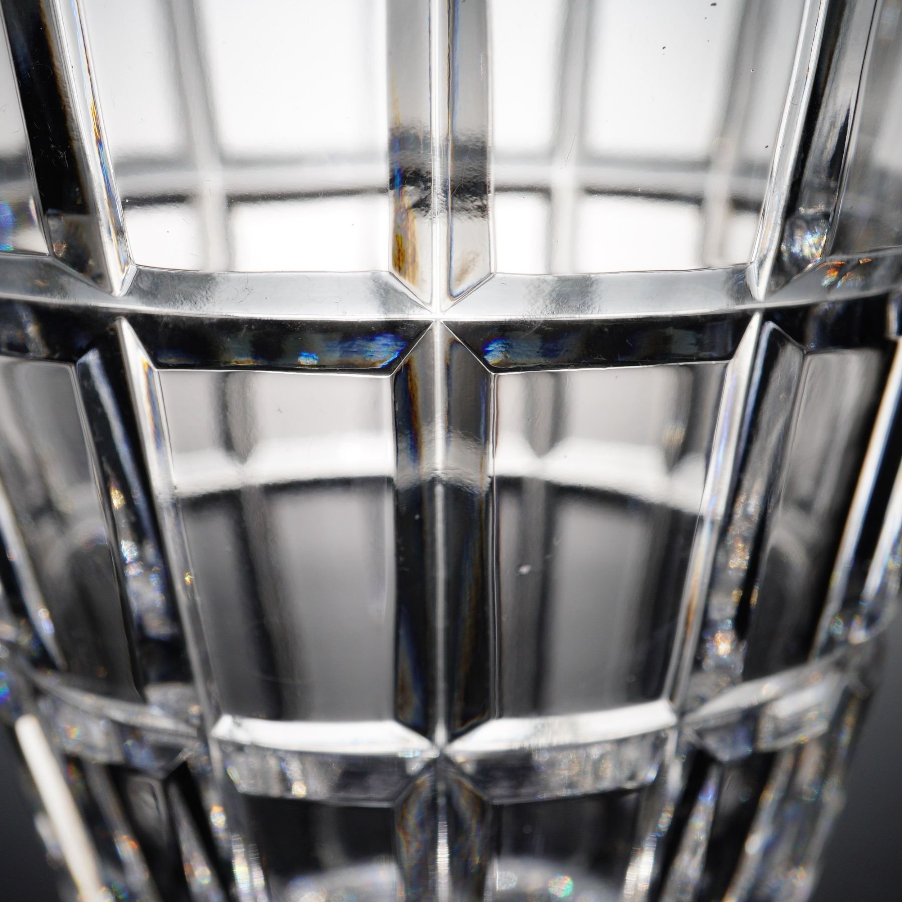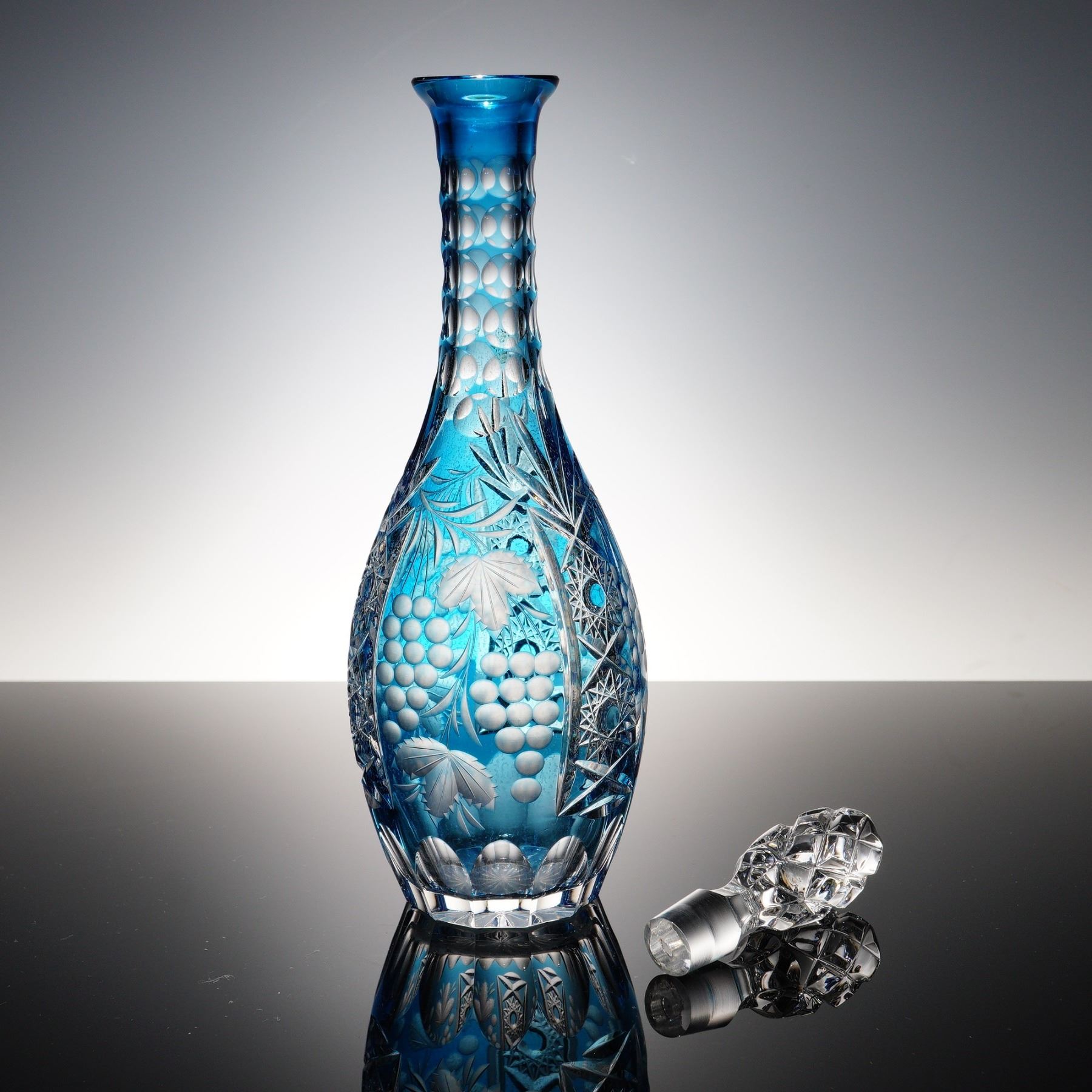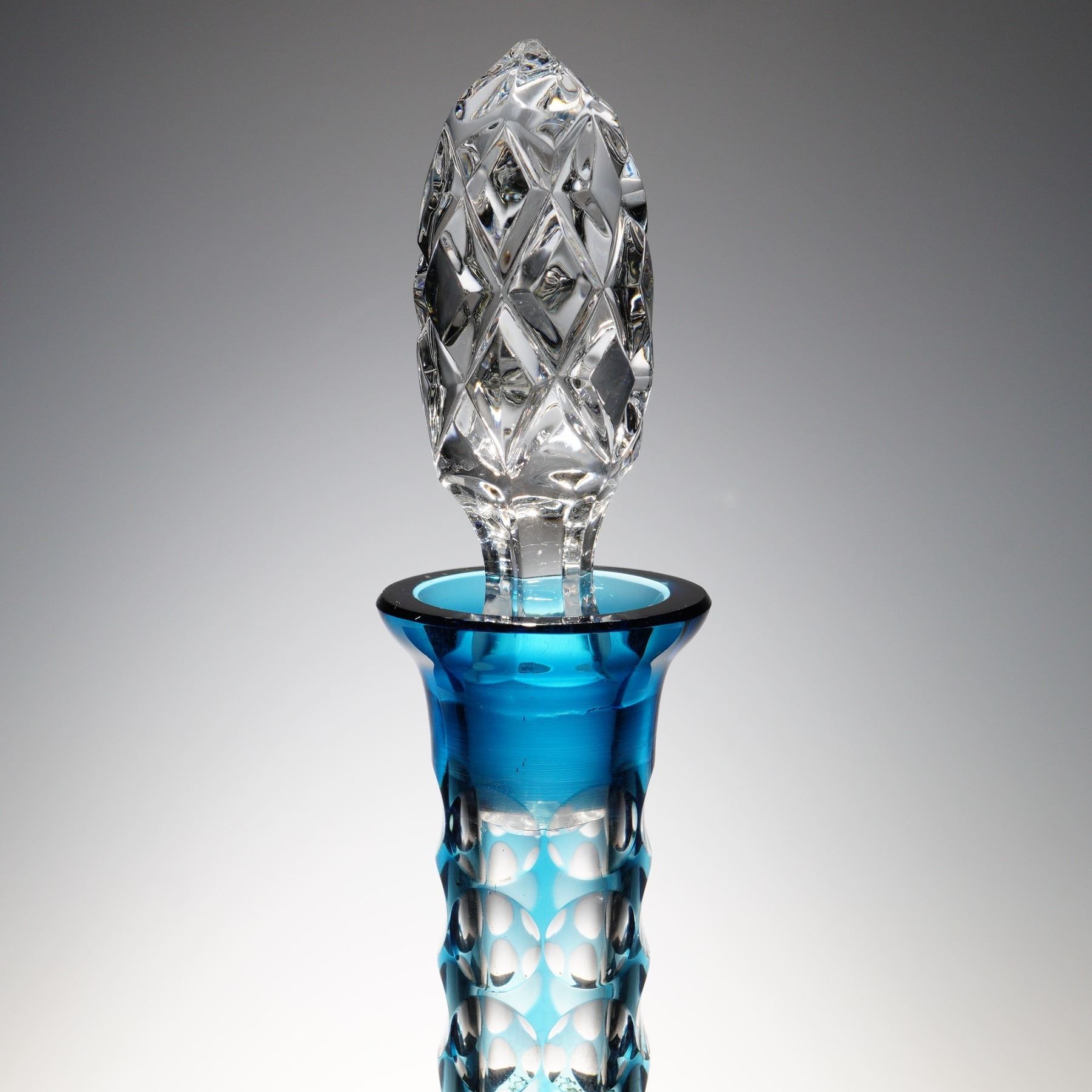 A striking Bohemian cut-to-clear crystal decanter in a vivid blue overlay, featuring an elegant teardrop form and an elaborately faceted stopper. The body is richly adorned with acid-etched grape clusters and vine leaves in frosted relief, framed by deep wheel-cut starbursts and vertical panels of geometric crosshatching. The tall neck is decorated with clear oval lens cuts and flares gently into a wide rim. The pineapple-shaped stopper is finely faceted and fits snugly. Unmarked, likely Czechoslovakia, mid-to-late 20th century. In excellent condition with no chips or cracks.