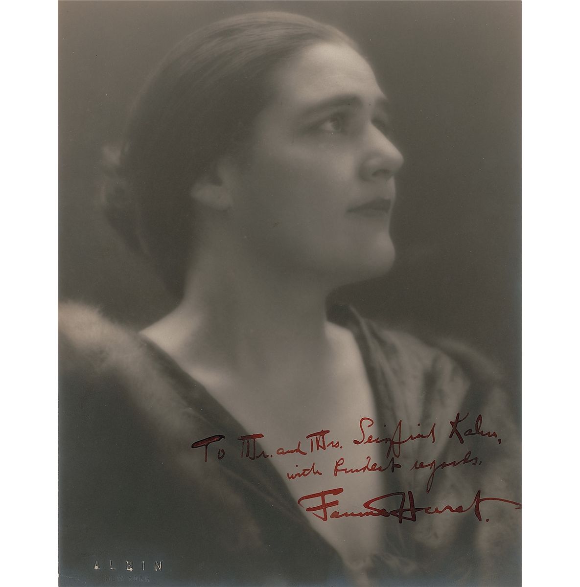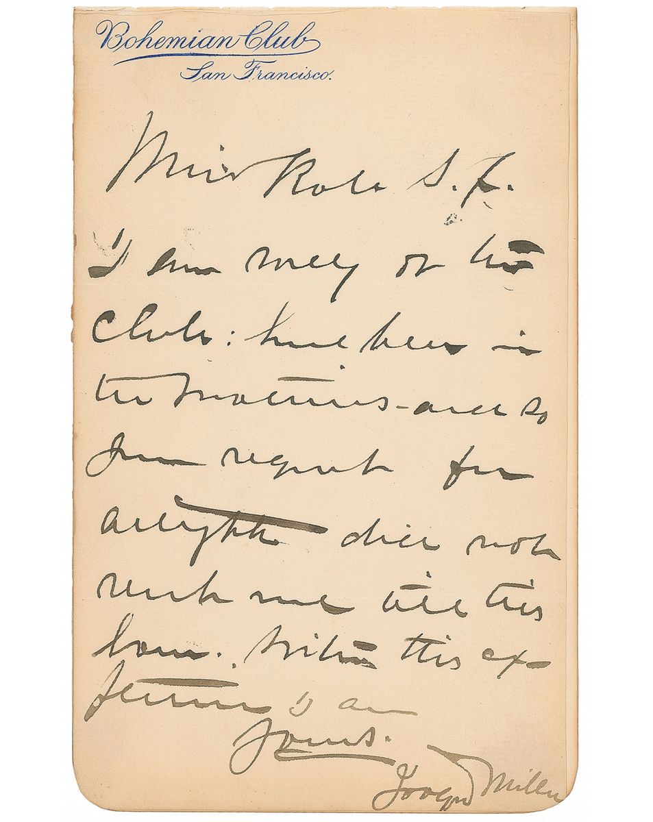 A collection of three items, all inscribed or written to Siegfried H. Kahn, a member of the Bohemian Club and famous host of musical parties in the 1920s and ‘30s. First, a short ALS, 4.75 x 7.5, on Bohemian Club letterhead by American poet, essayist, and fabulist Joaquin Miller; second, a 7 x 9 matte-finish photo of the celebrated American novelist Fannie Hurst, boldly signed and inscribed in red ink; and third, a 7.5 x 9.75 matte-finish photo of Hugo Grunwald, Treasurer of the Bohemian Club, signed and inscribed in fountain pen. In overall very good to fine condition, with slight toning to the Miller, slightly trimmed edges to the photos, small indentations to Grunwald’s forehead area, and mounting remnants to lower border of the Grunwald.