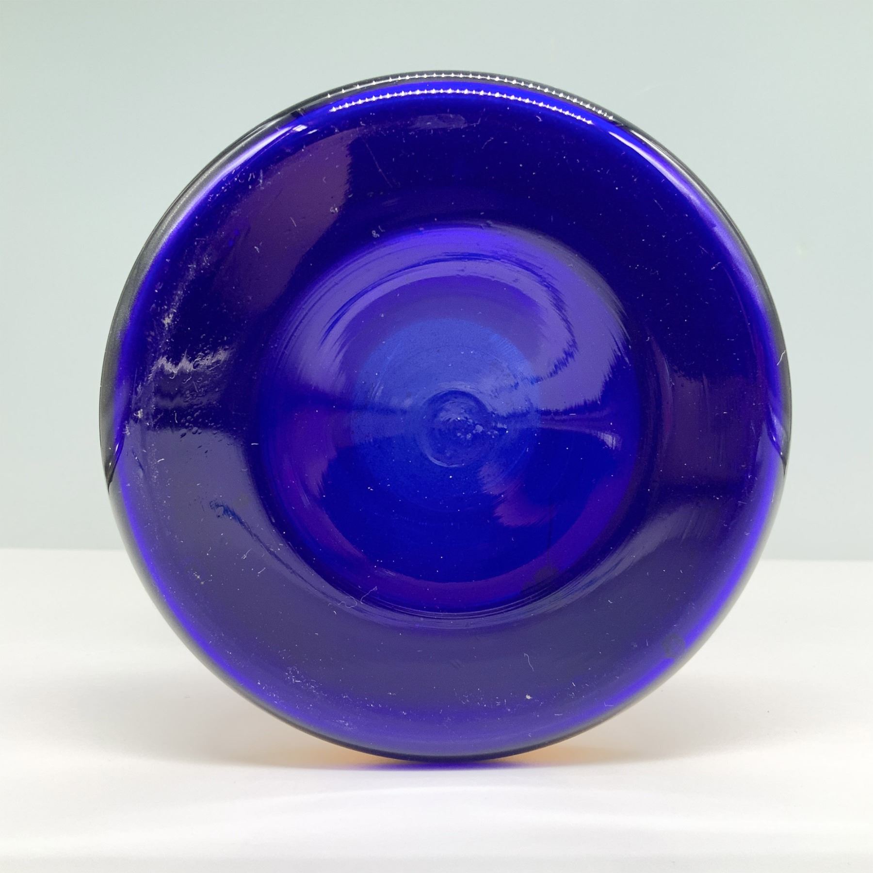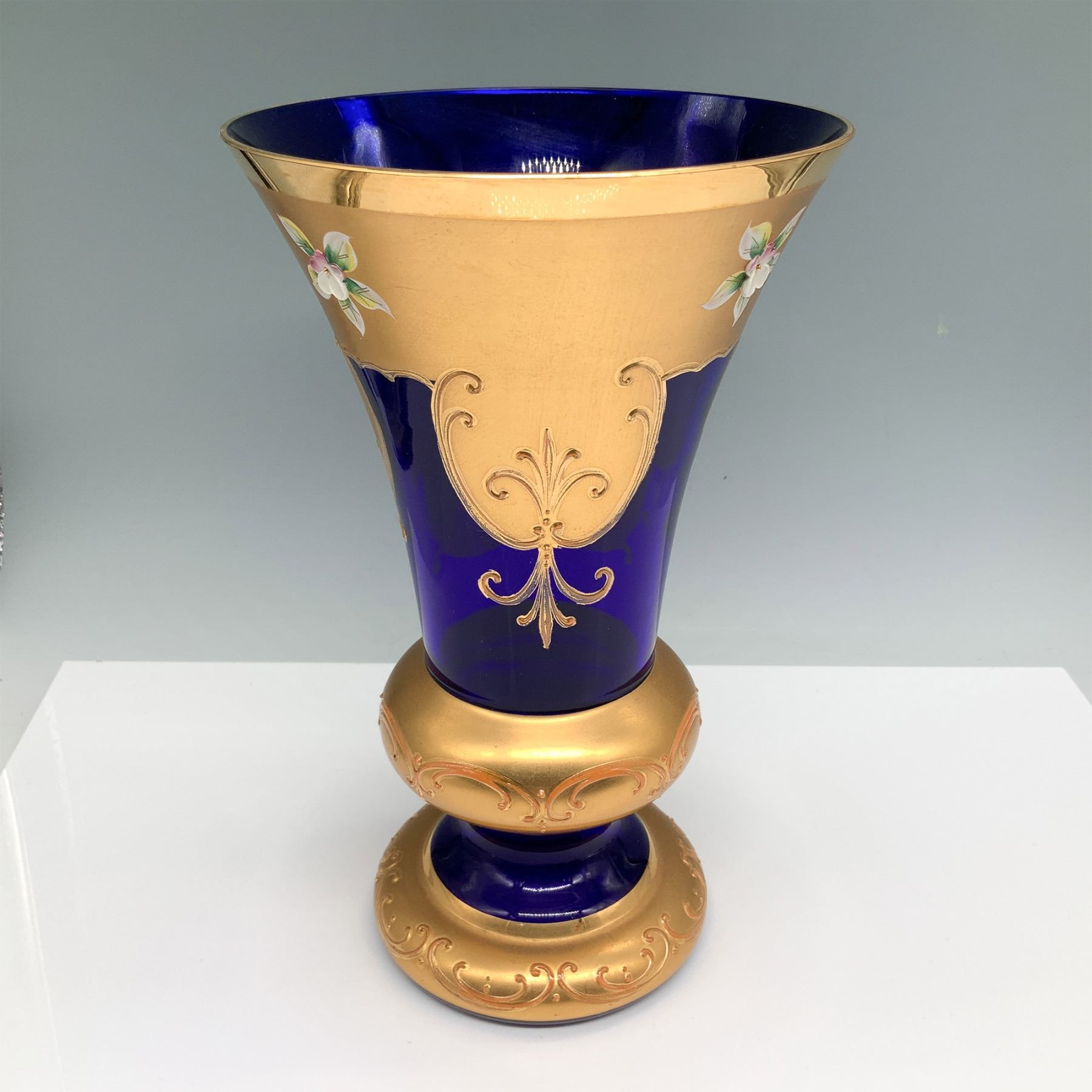 Elegant Bohemian cobalt blue glass vase with elaborate hand-painted gilt detailing and floral enamel accents. The vase features an intricate raised gold pattern with scrolling motifs and applied white and green floral designs. The flared rim is adorned with a gold band, while the pedestal base is also richly gilded with ornamental scrollwork. The deep cobalt hue provides a striking contrast to the opulent gold embellishments, making this a fine example of European glass artistry.