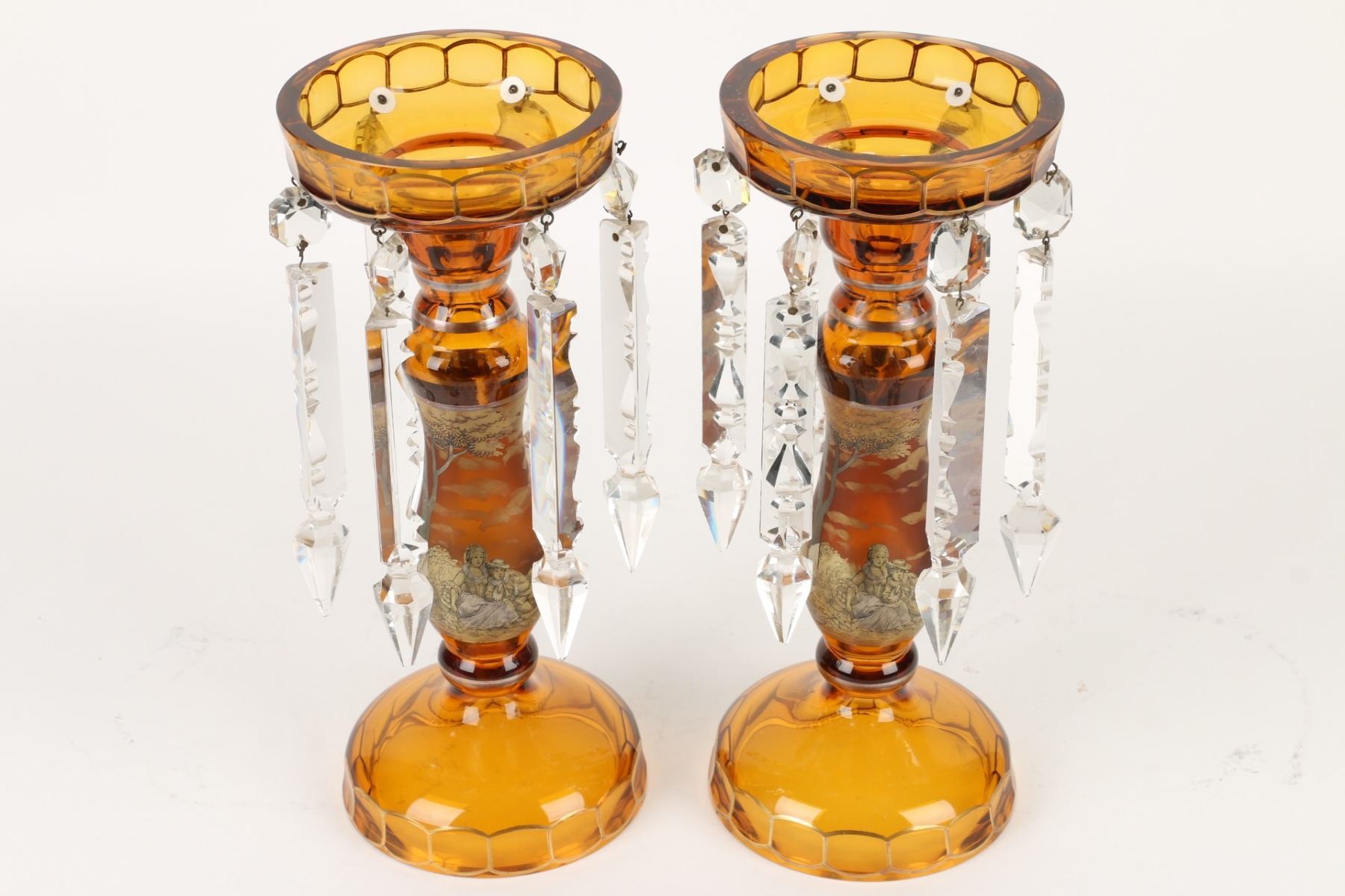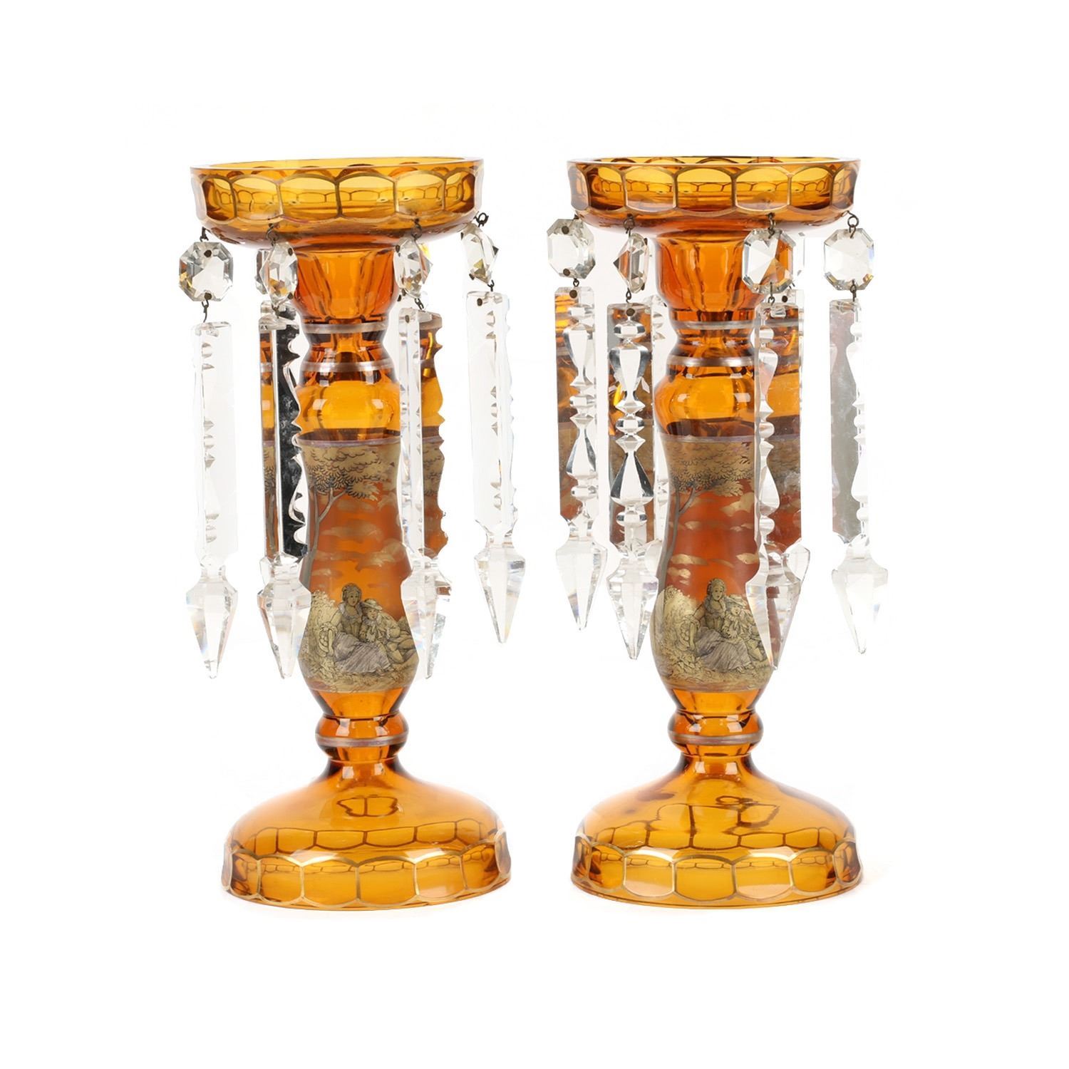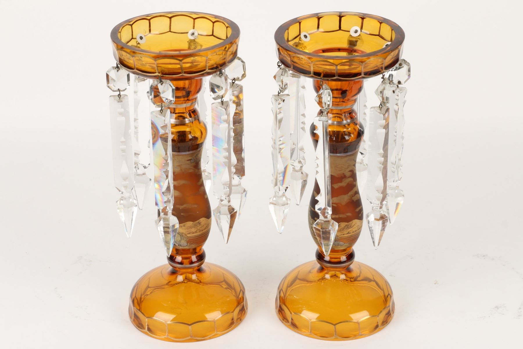 Lot 8 - Czechoslovakian. Yellow-amber cut glass with gilt serenade scene. Six (6) cut glass prisms each. 5" x 11.75" (h). A few chips to the tips of the crystal prisms. $300-400.