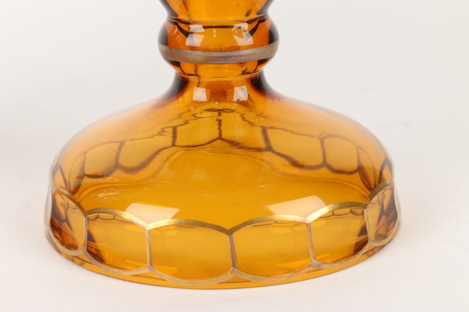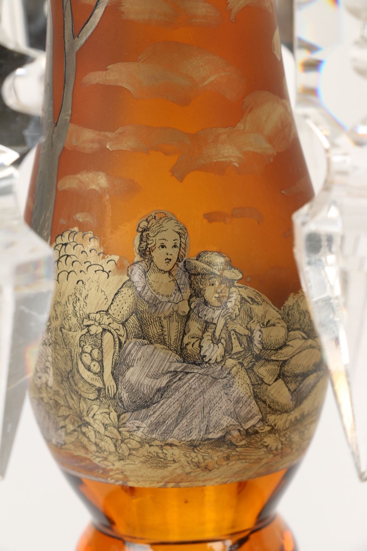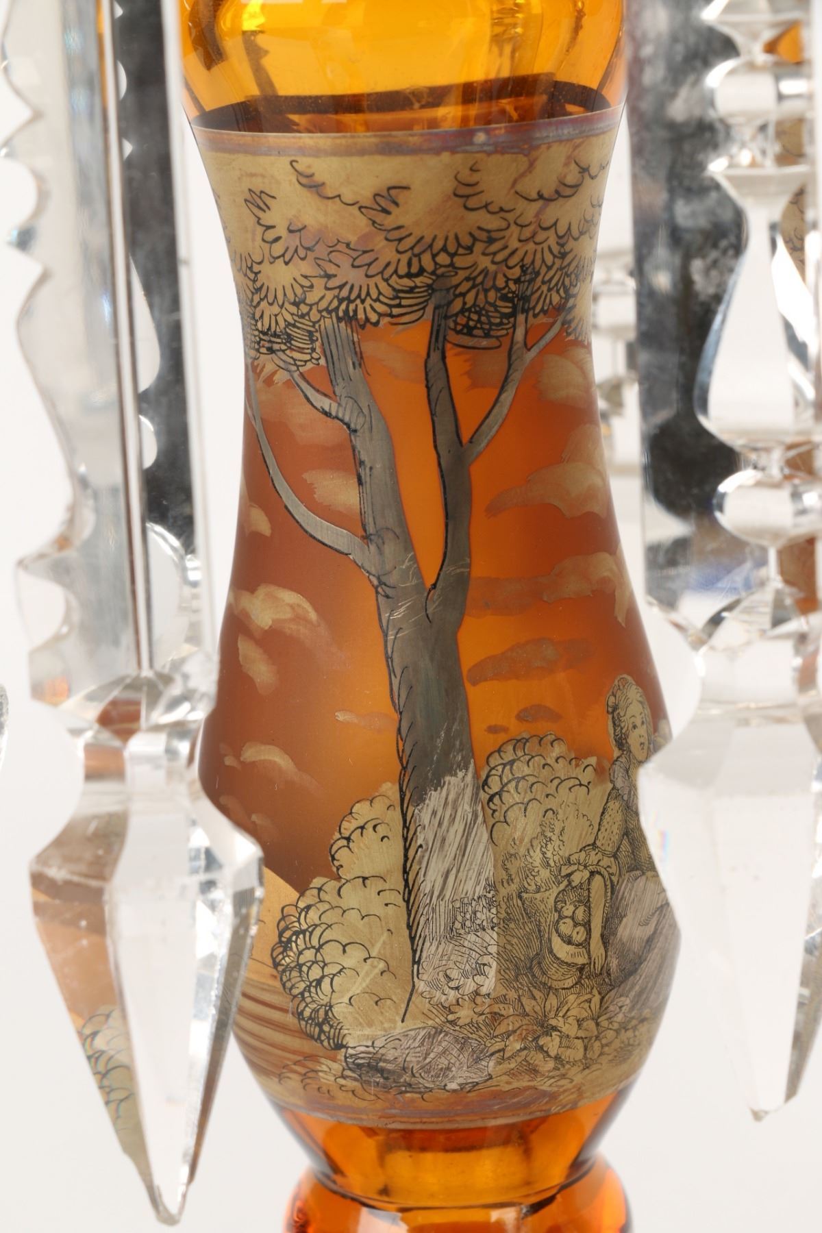Lot 8 - Czechoslovakian. Yellow-amber cut glass with gilt serenade scene. Six (6) cut glass prisms each. 5" x 11.75" (h). A few chips to the tips of the crystal prisms. $300-400.