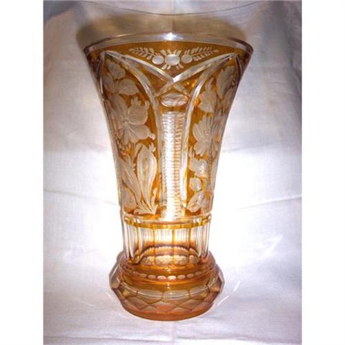 Exquisite Bohemian cut etched crystal Amber vase. Beautiful floral design.