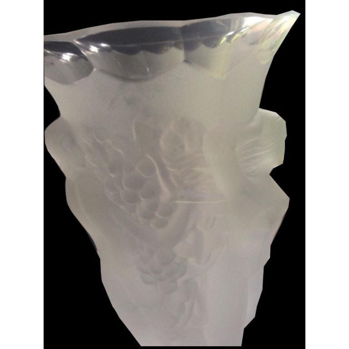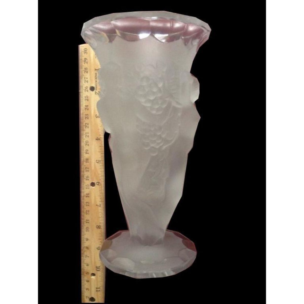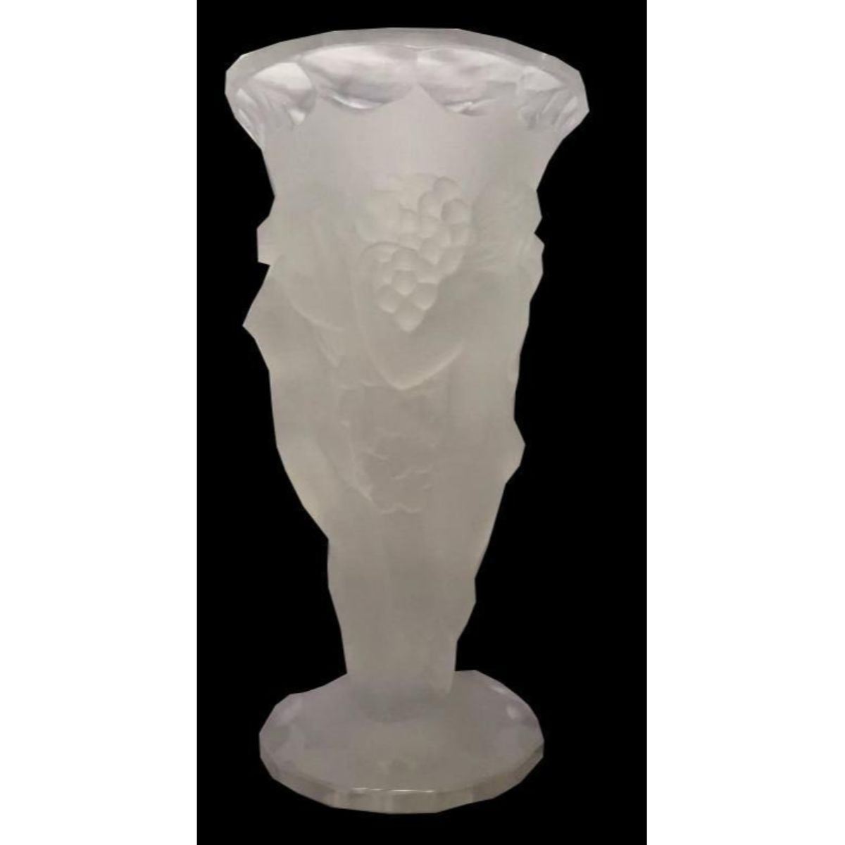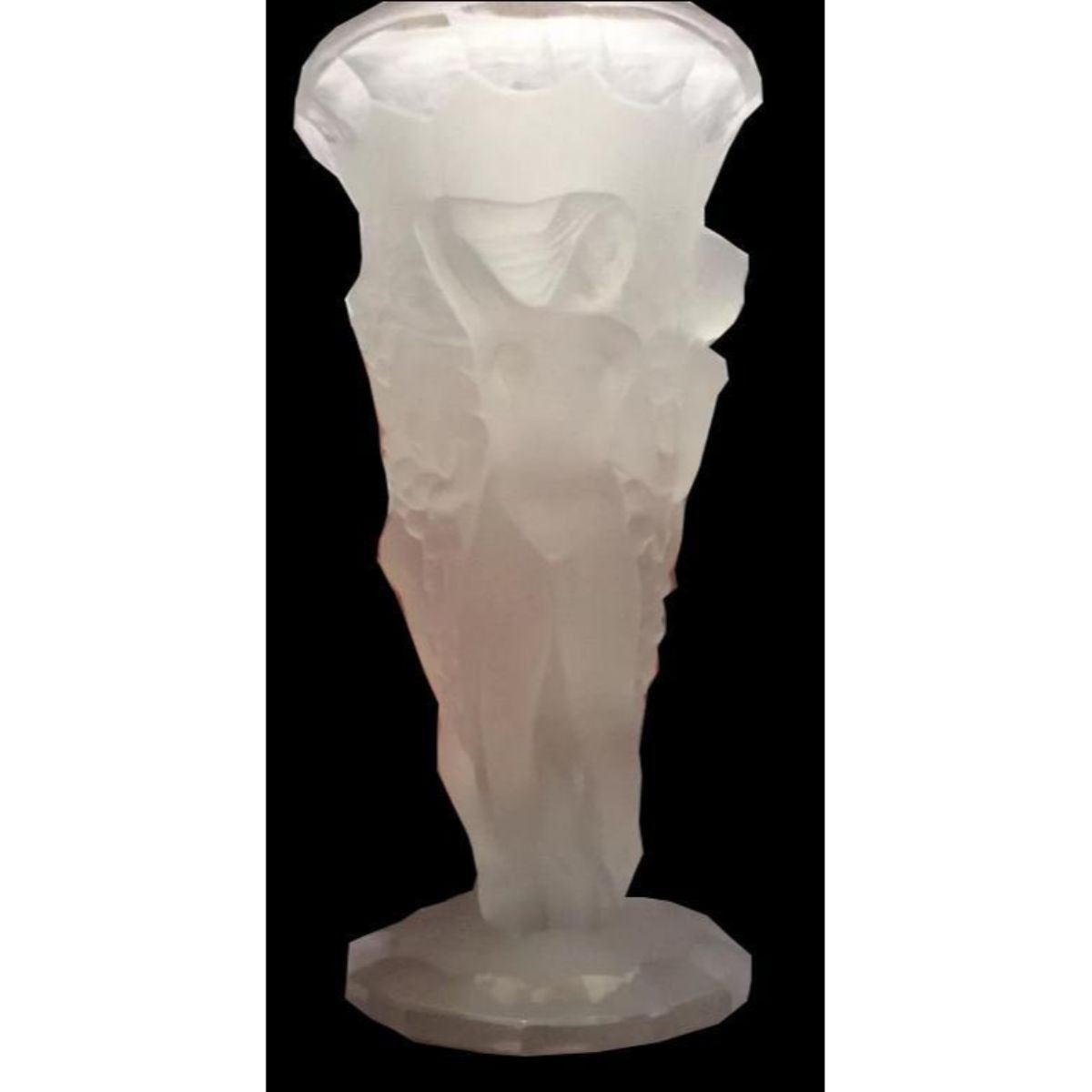 Czech Bohemian frosted glass vase, depicting dancing nudes during a grape harvest. Signed Desna on the bottom. 8 1/2" H X 5"D.