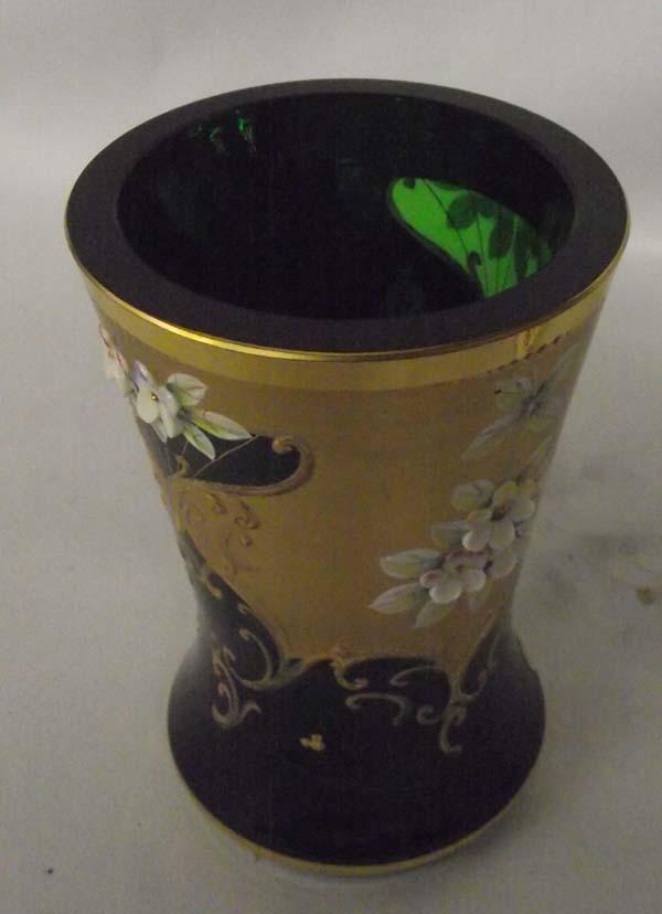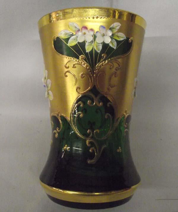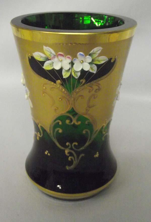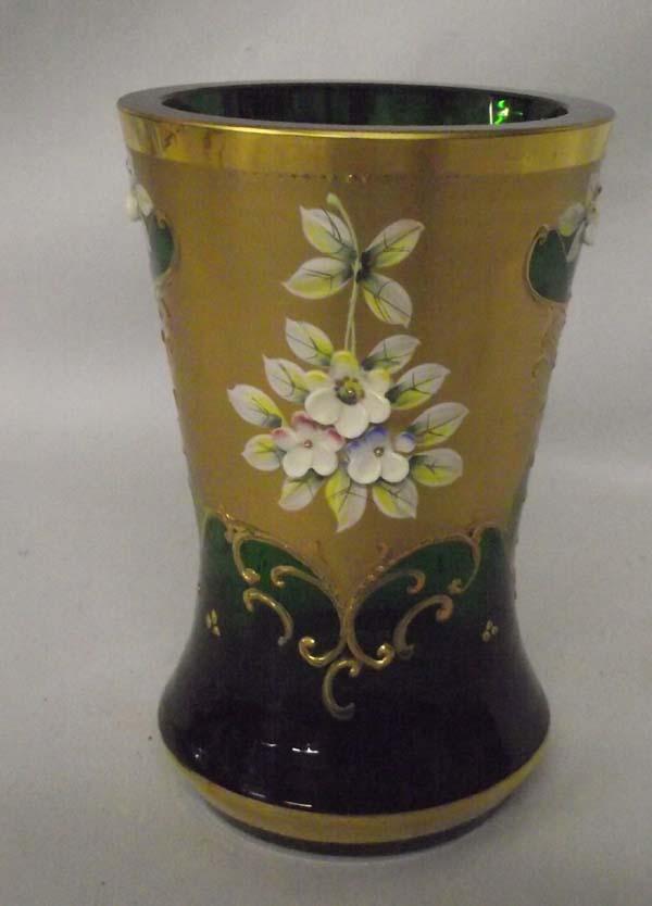 Bohemian green glass vase. Gold gilt with raised flowers. 5.5'' T X 3.5'' diameter. Original label marking. Heavy glass. Buyers Pay Actual Shipping and Handling Charges(see terms and conditions for more information).