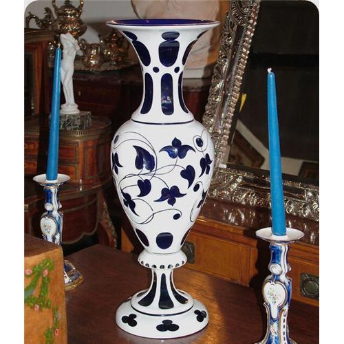 large size Bohemian Overlay Glass vase ,White cut on blue in perfect conditions.