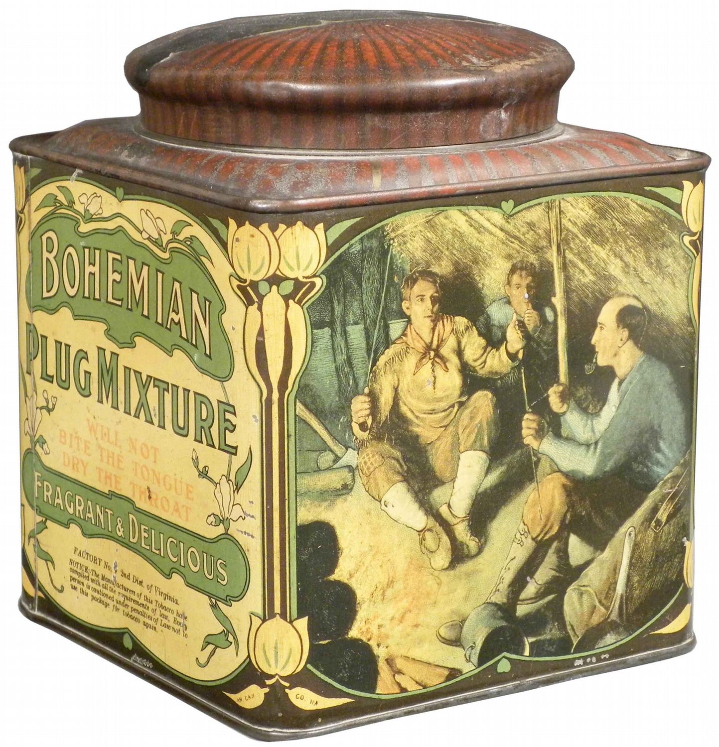 Bohemian Plug Mixture Tobacco Tin. Litho depicting aristocratic man on one side and Scouts camping, all enjoying their evening smoke. American Can Co. Excellent condition. 5 inches square X 6 inches tall.