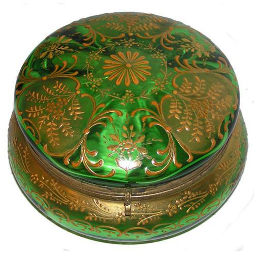 <tr><td>Title:Bohemian Round Green Glass Powder Box</td></tr>