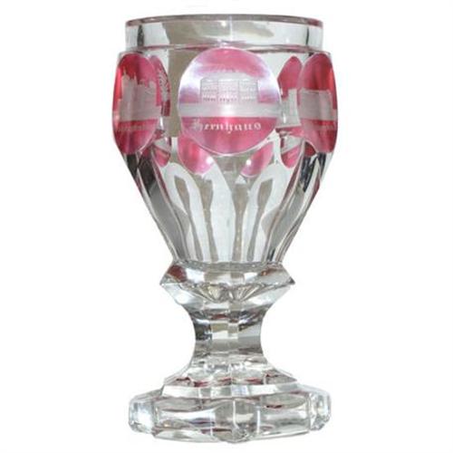 </font></strong>This lovely antique Bohemian spa goblet with flashed, engraved ruby colored glass, depicts four of leading German spas of the nineteenth century, including Doppelburg and Schlangenbad. Measures 6" tall and 3" across. Excellent condition. There are no cracks and only a small chip from the underside. Underside features a geometric engraved pattern.