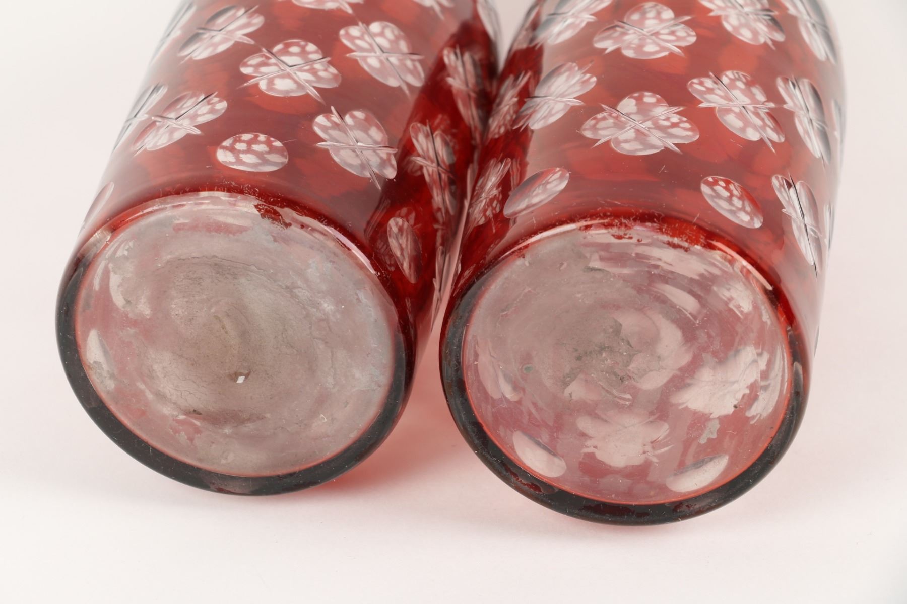Lot 406 - Pair (2). Late 19th century. Thin ruby flash cut to clear with crossed quatrefoil design. Blown glass bodies and stoppers with polished pontils on bottles. 14.5" h. One stopper end wrapped with old tape for better fit. $200-300.
