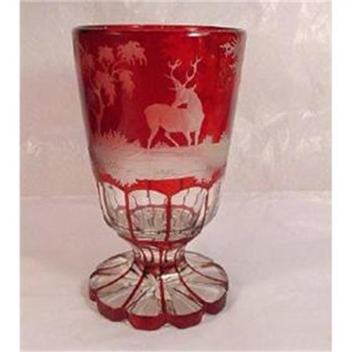 A large tumbler or vase, 19th century Bohemian glass flashed ruby. It has a very good engraving of a stag with trees either side. The stag is very well detailed, you can see its ribs and the fur on the neck.